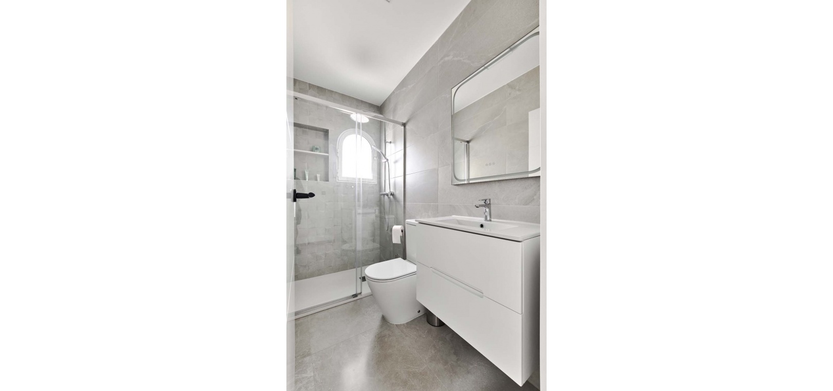 En hall från vardagsrummet leder till två sovrum på bottenvåningen, båda rymliga med inbyggda garderober och nyinstallerade varm- och kallluftsaggregat. I slutet av hallen finns ett vackert moderniserat familjebadrum med en rymlig duschkabin.