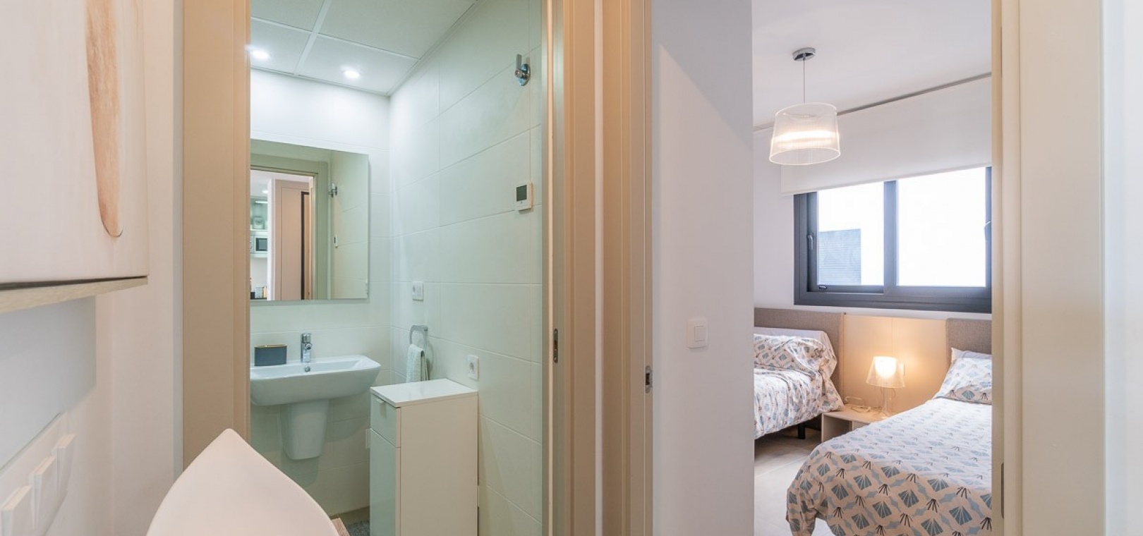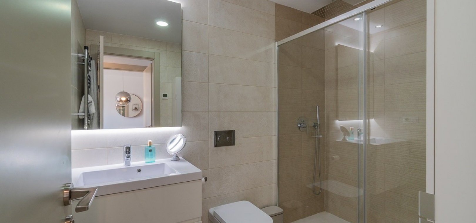 Ljust vardagsrum/matrum med rikligt naturligt ljus, som öppnar upp mot en privat terrass Två eleganta sovrum med inbyggda garderober Två moderna badrum med golvvärme Fullt utrustat kök med öppen planlösning Central luftkonditionering för varma och kalla årstider