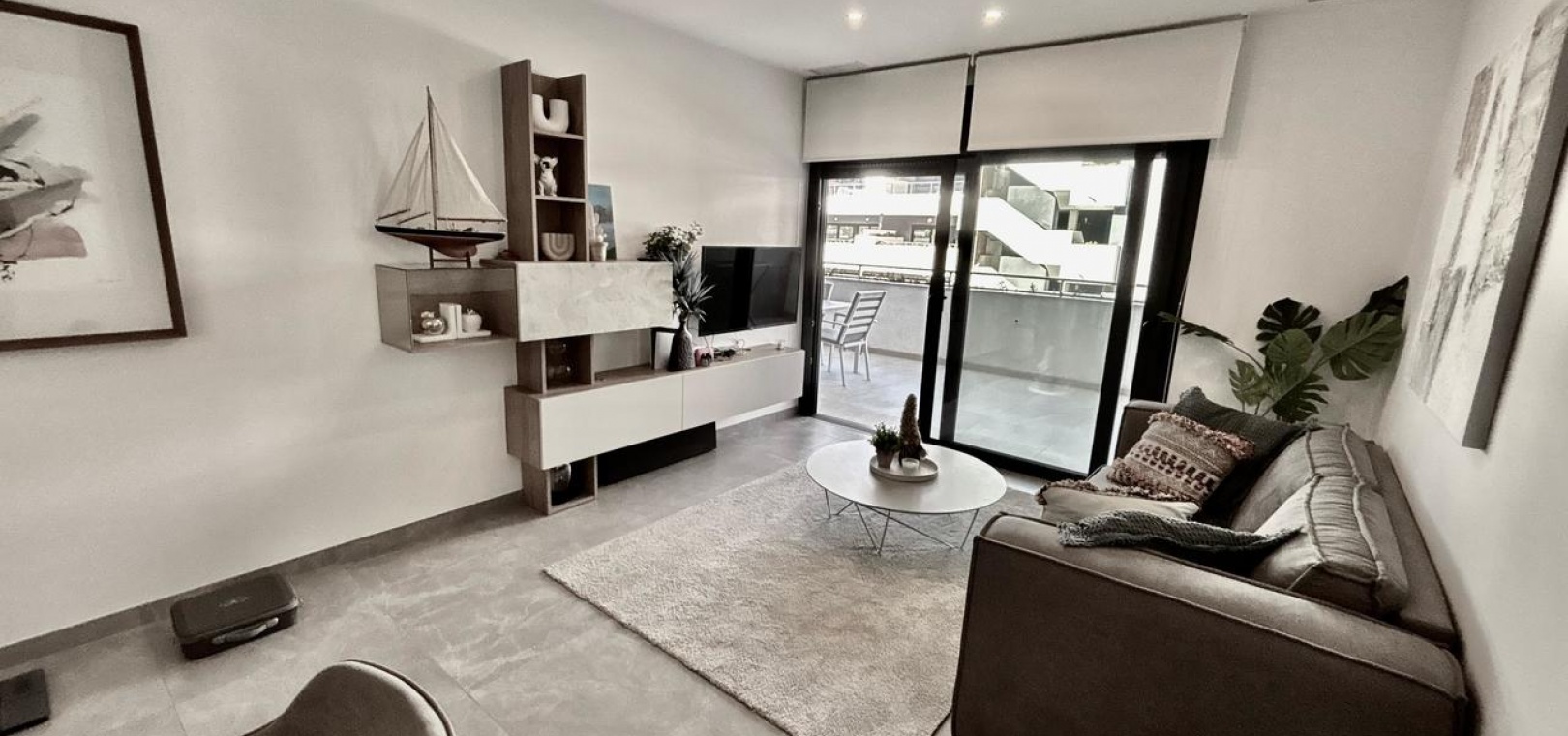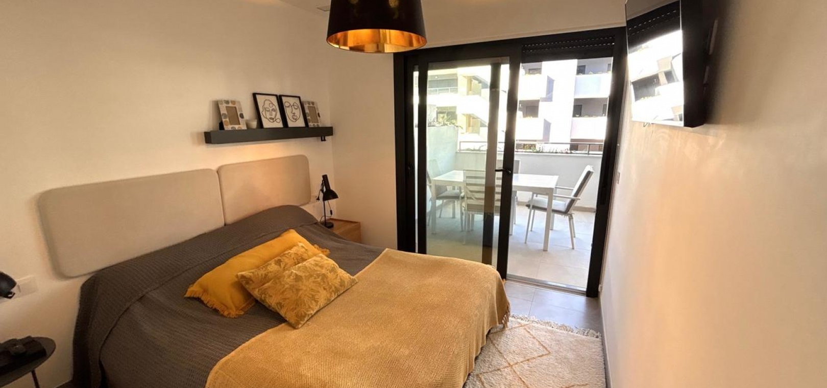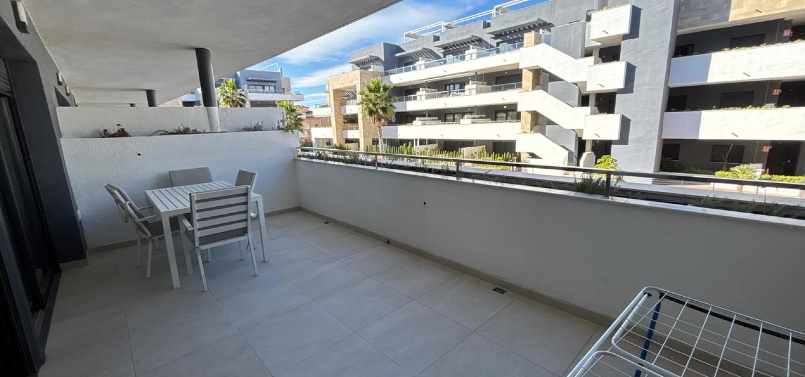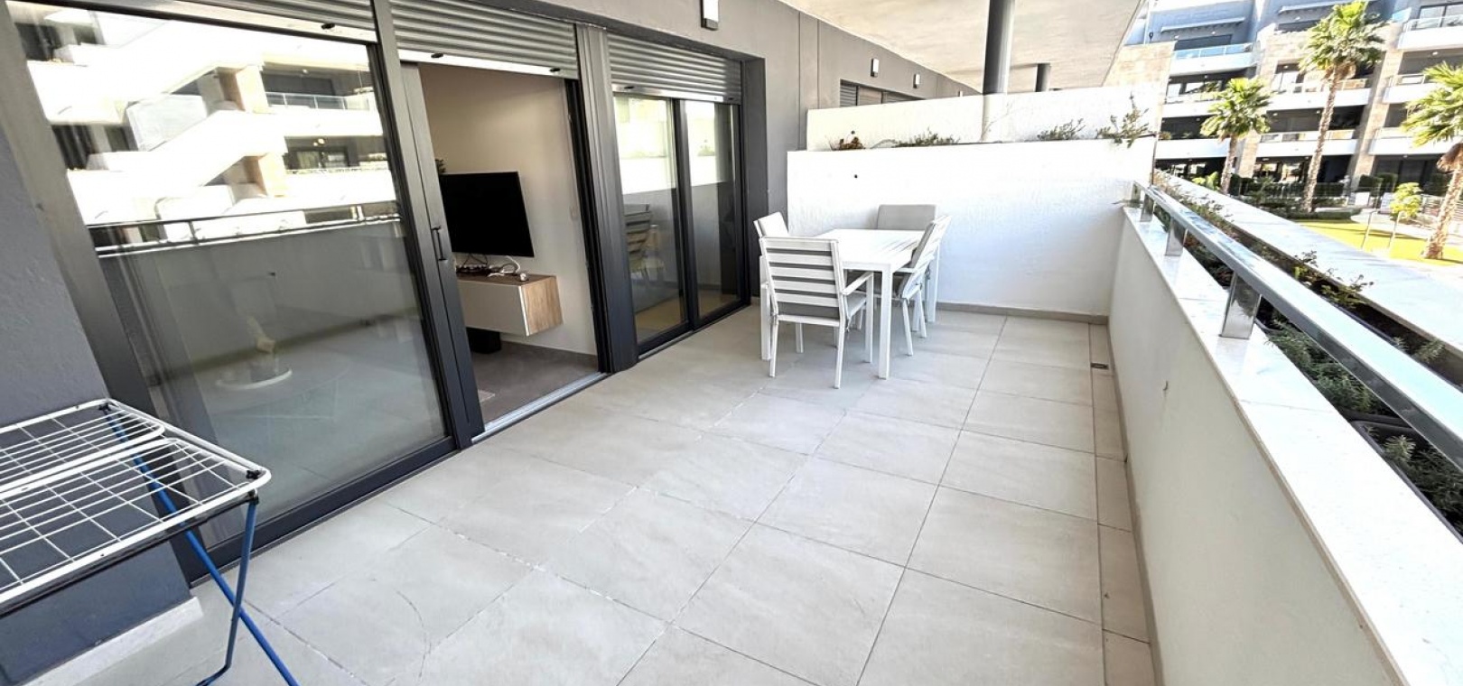Denna helt nya, moderna lägenhet ligger i den mycket eftertraktade Flamenca Village och har en balkong i sydvästläge med härlig utsikt över det vackert underhållna gemensamma poolområdet.
