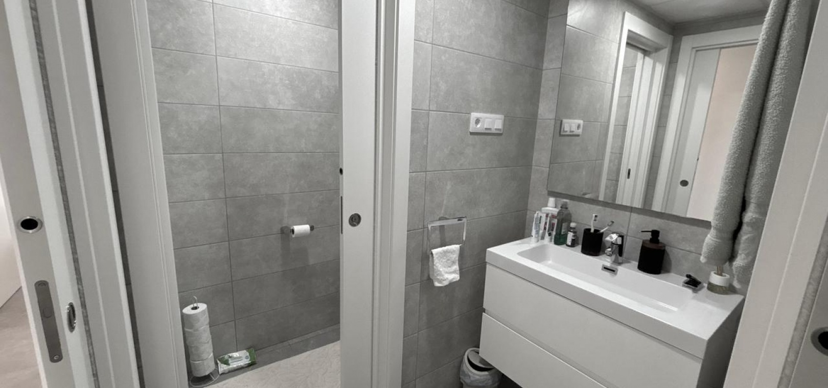 En hall från vardagsrummet leder till två sovrum , ett familjebadrum och ett stort förråd . Det stora sovrummet har ett eget badrum och skjutdörrar som ger direkt tillgång till balkongen .