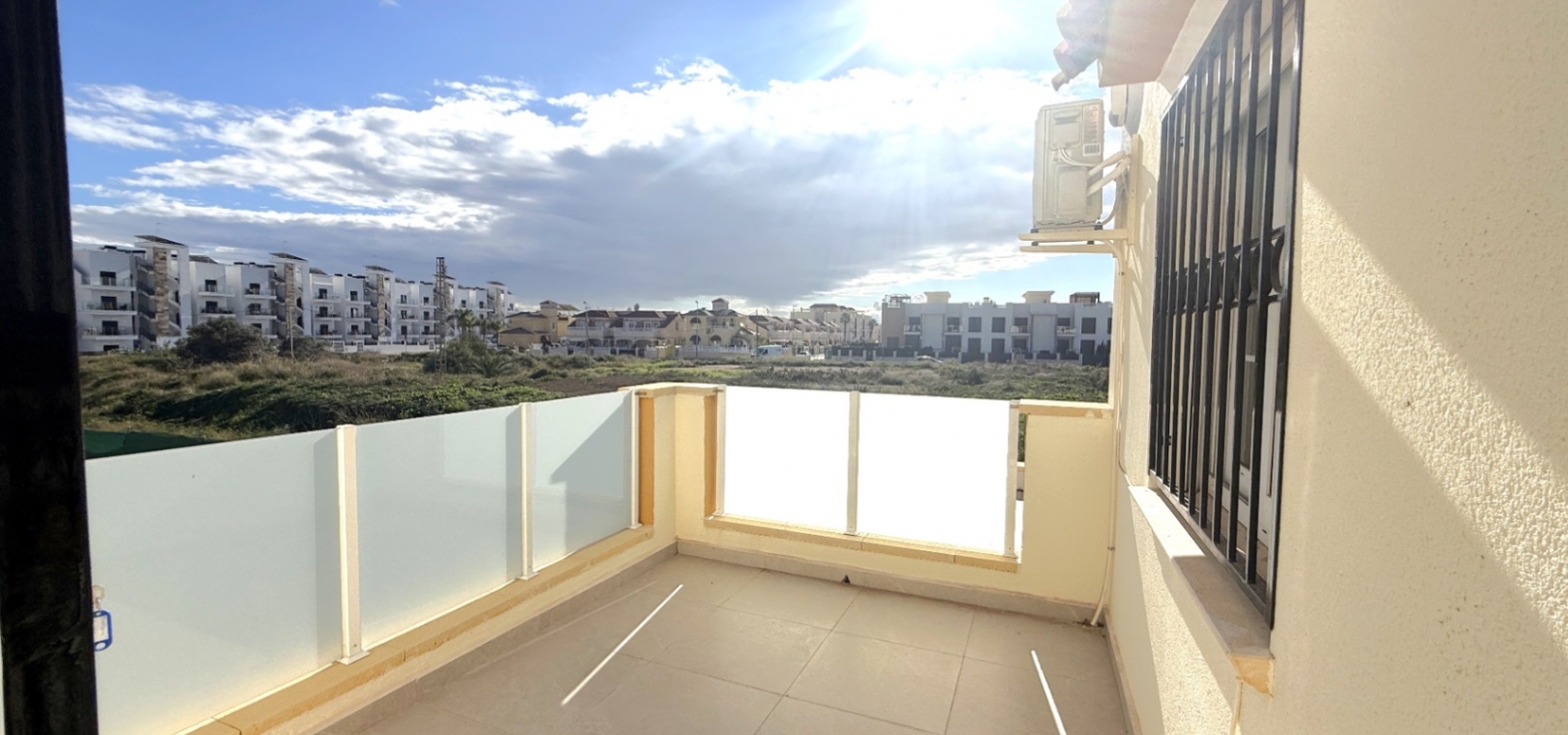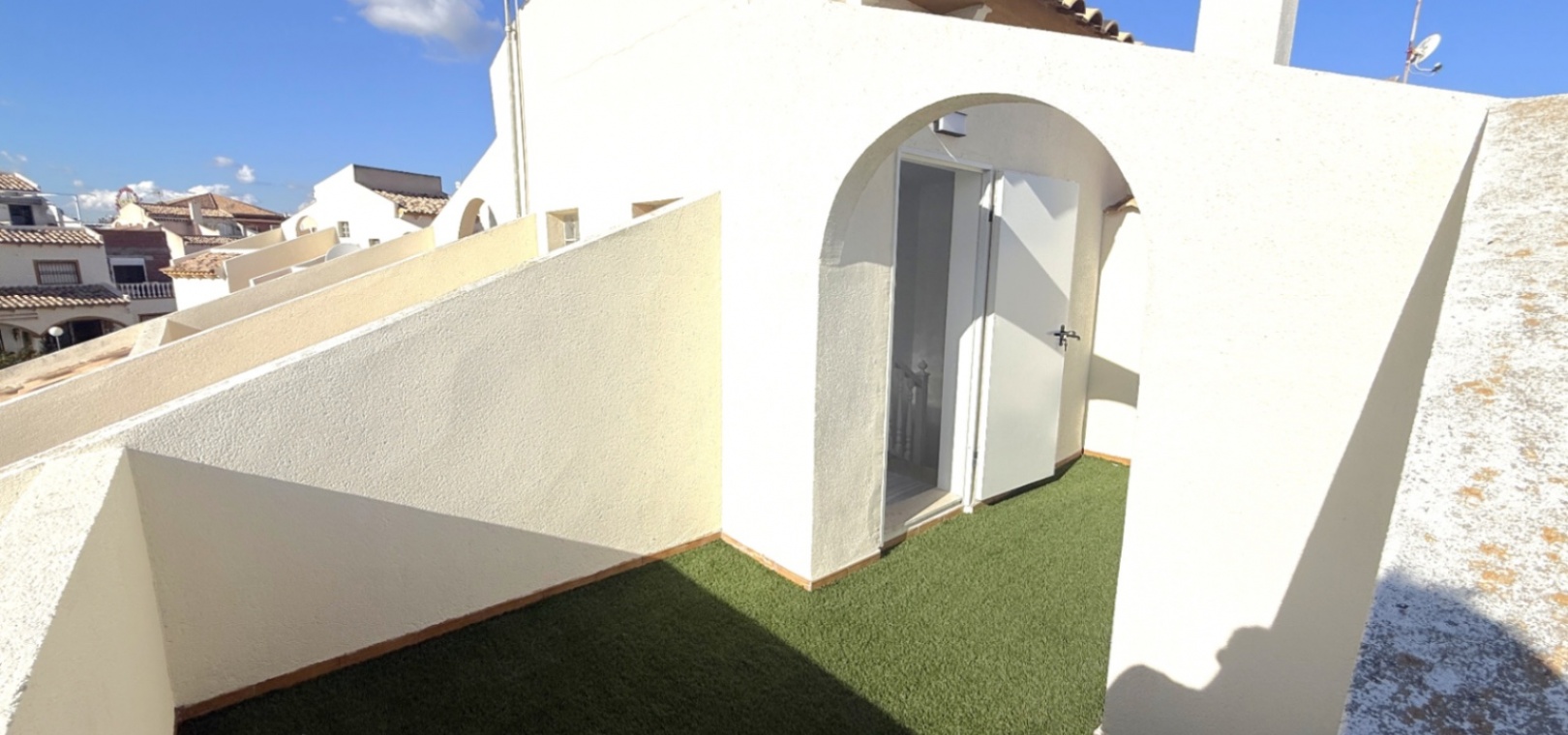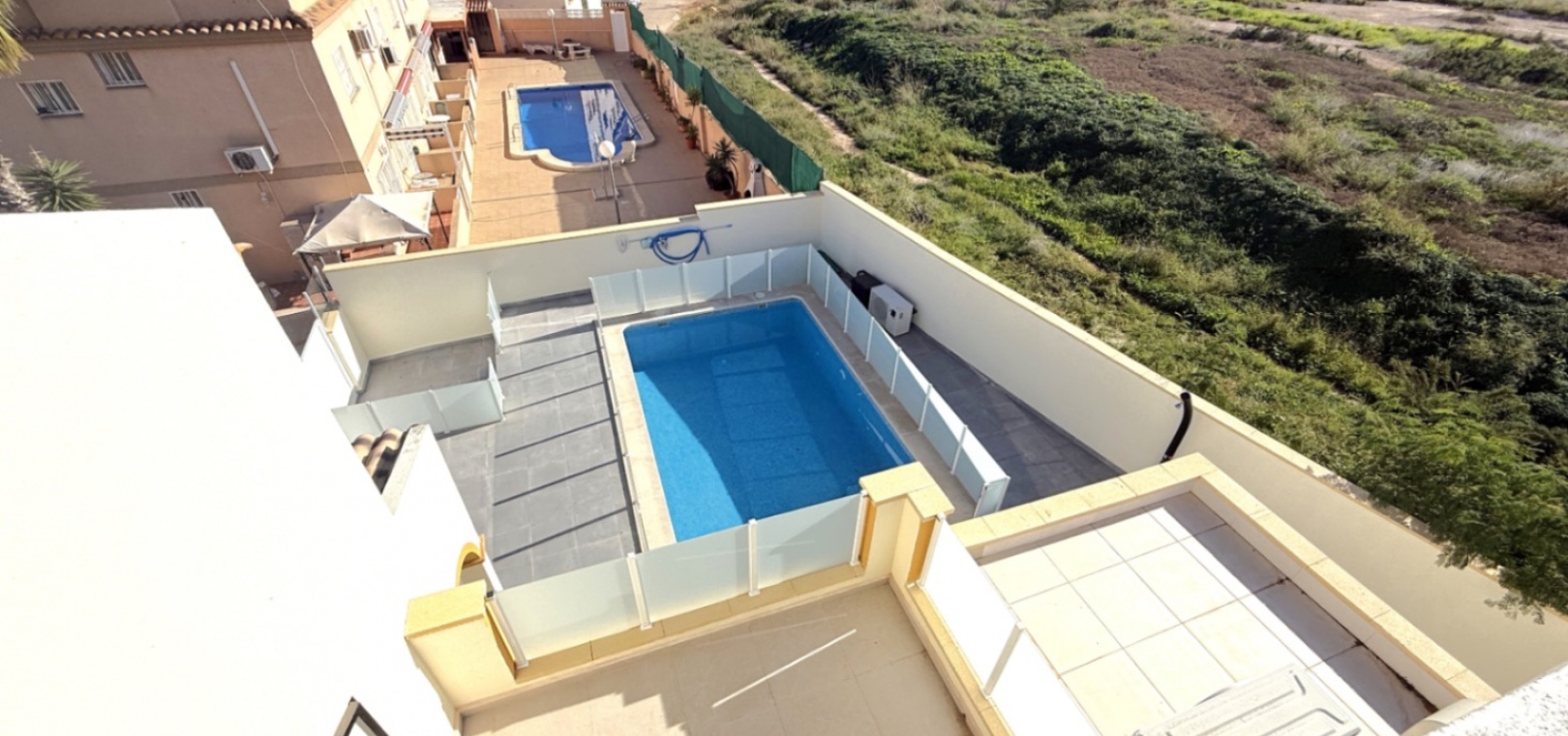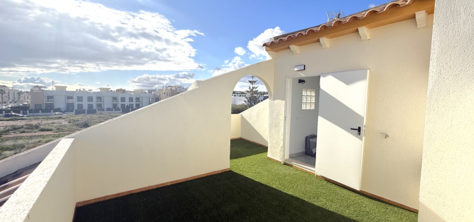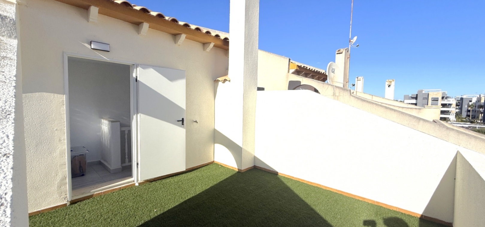 Båda sovrummen har inbyggda garderober och luftkonditionering, och det stora sovrummet har tillgång till en solbalkong med utsikt över poolen. Solariumet på översta våningen, belagt med konstgräs, erbjuder fantastisk utsikt över omgivningarna och till och med glimtar av havet – bara 10 minuters promenad bort.