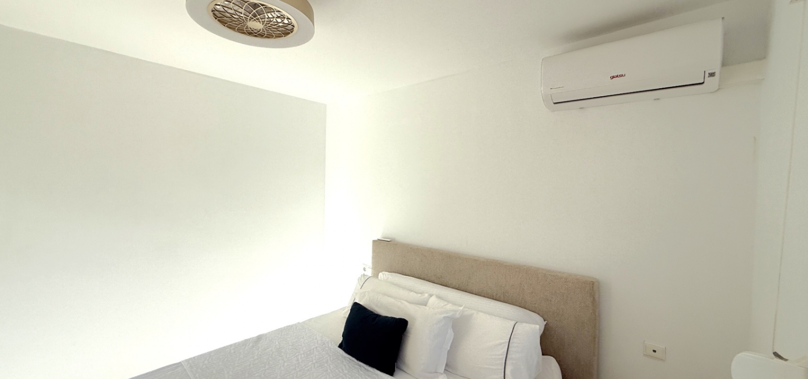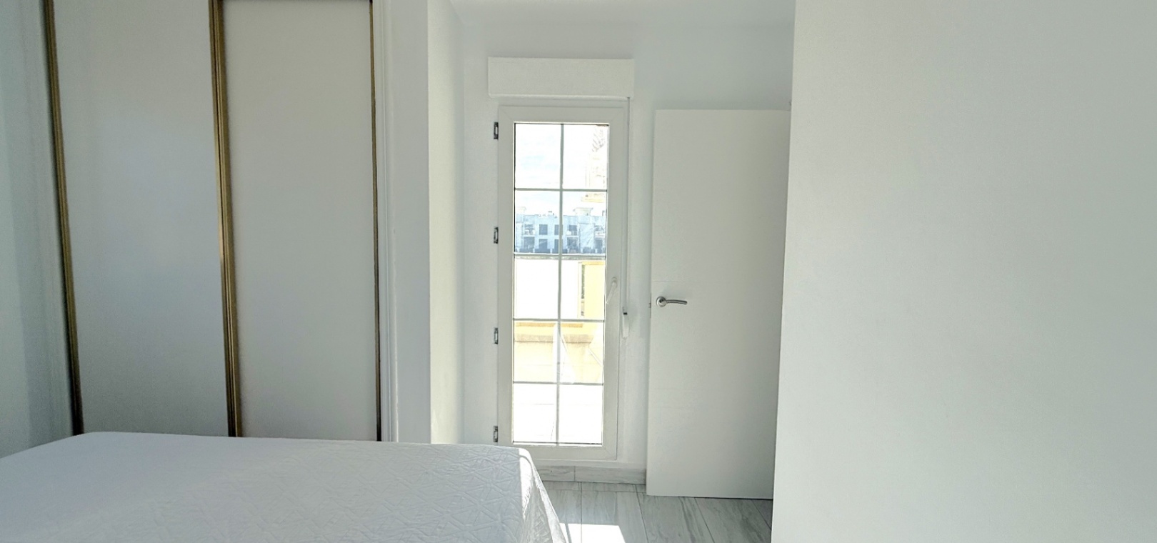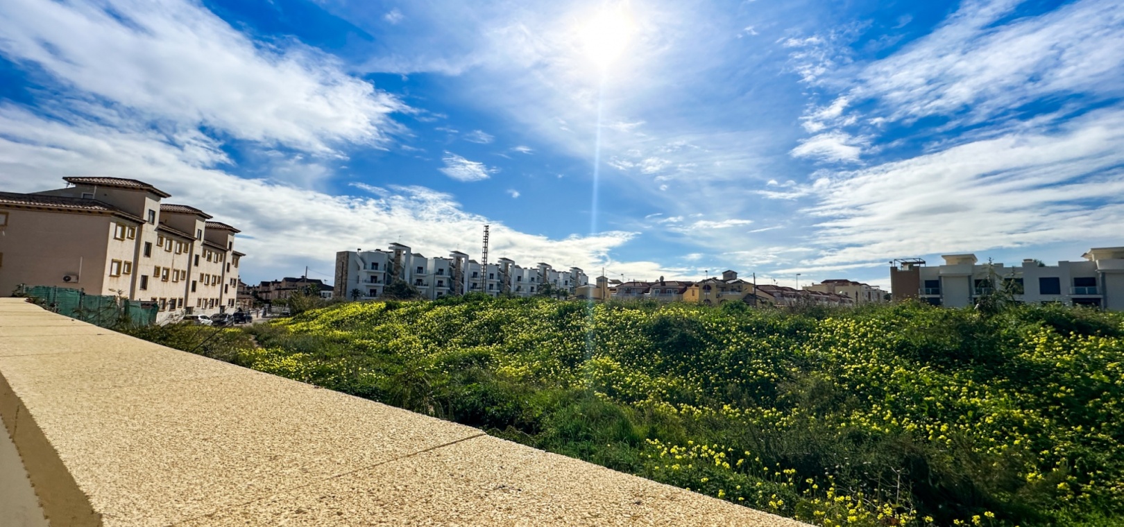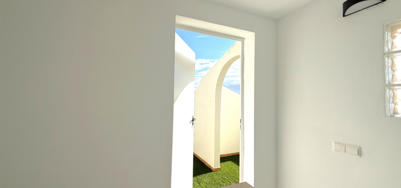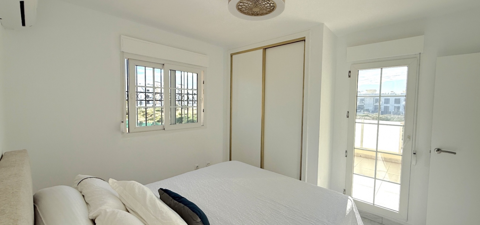 Båda sovrummen har inbyggda garderober och luftkonditionering, och det stora sovrummet har tillgång till en solbalkong med utsikt över poolen. Solariumet på översta våningen, belagt med konstgräs, erbjuder fantastisk utsikt över omgivningarna och till och med glimtar av havet – bara 10 minuters promenad bort.