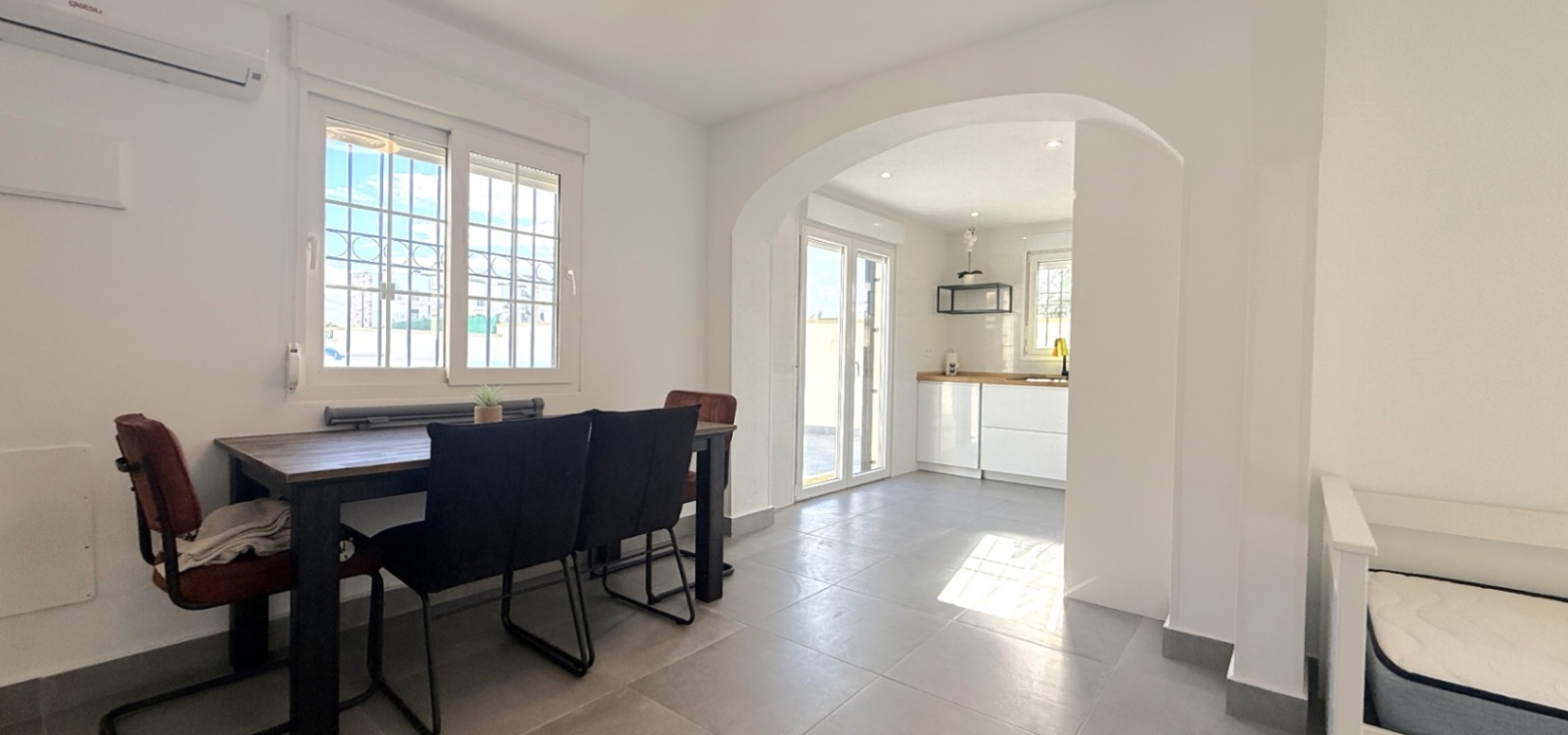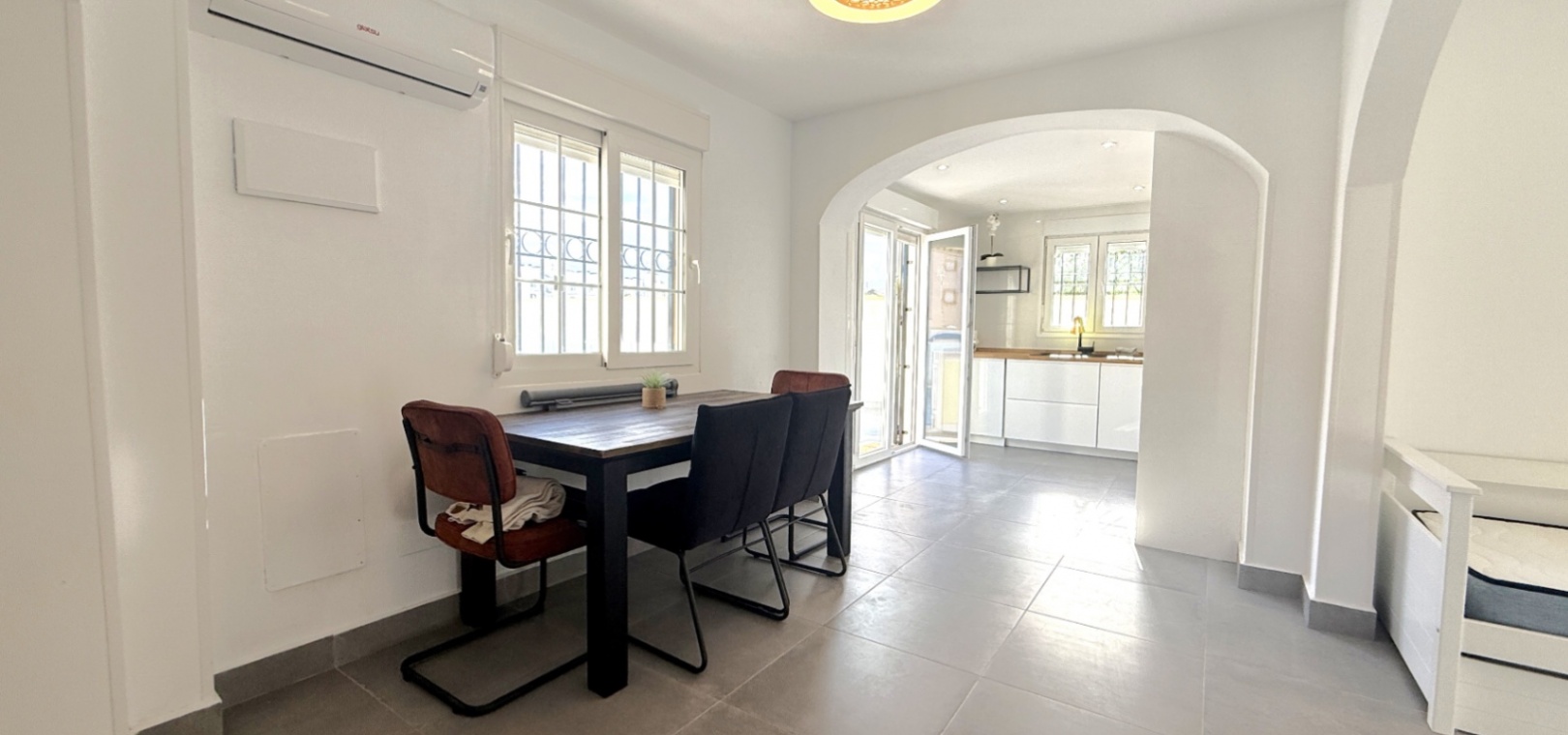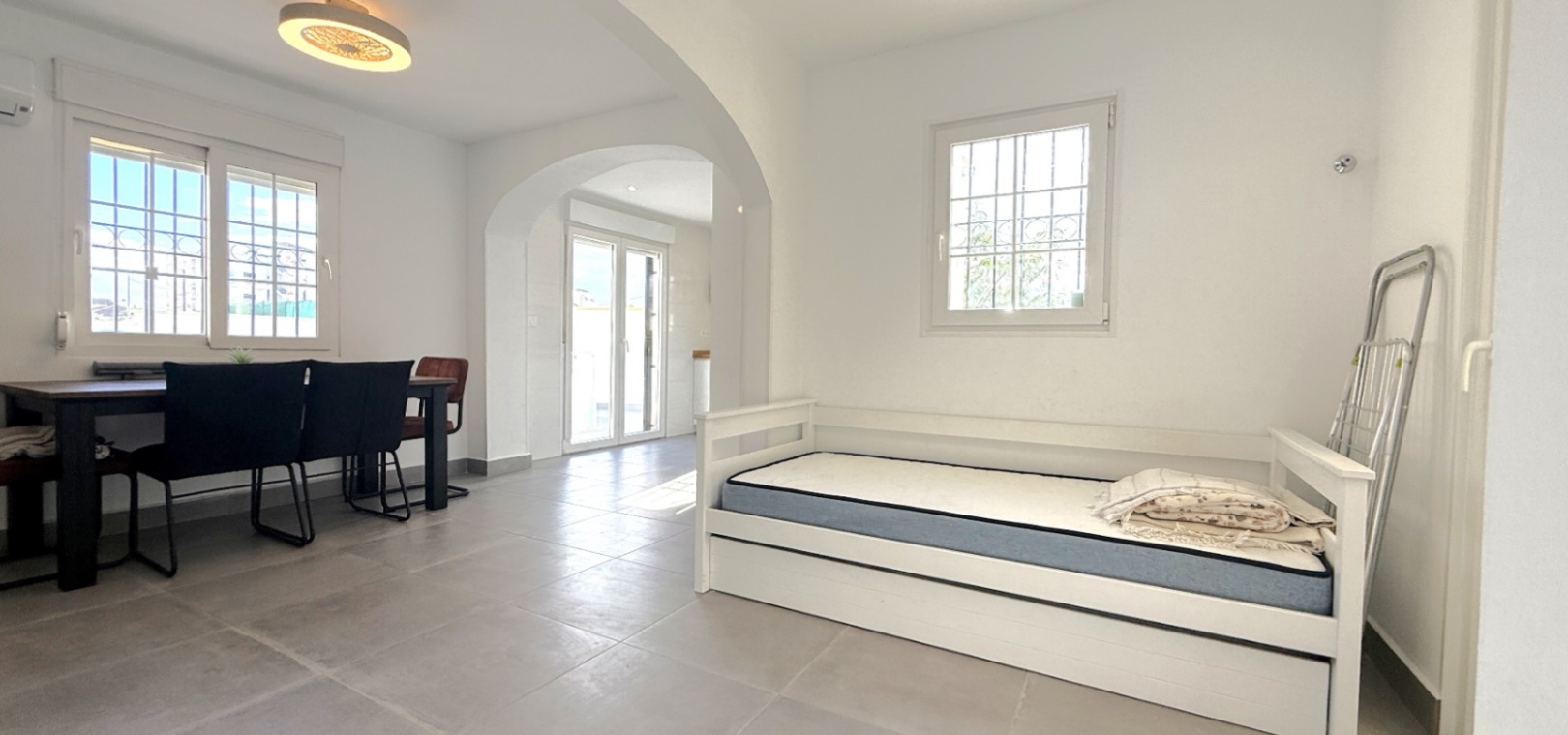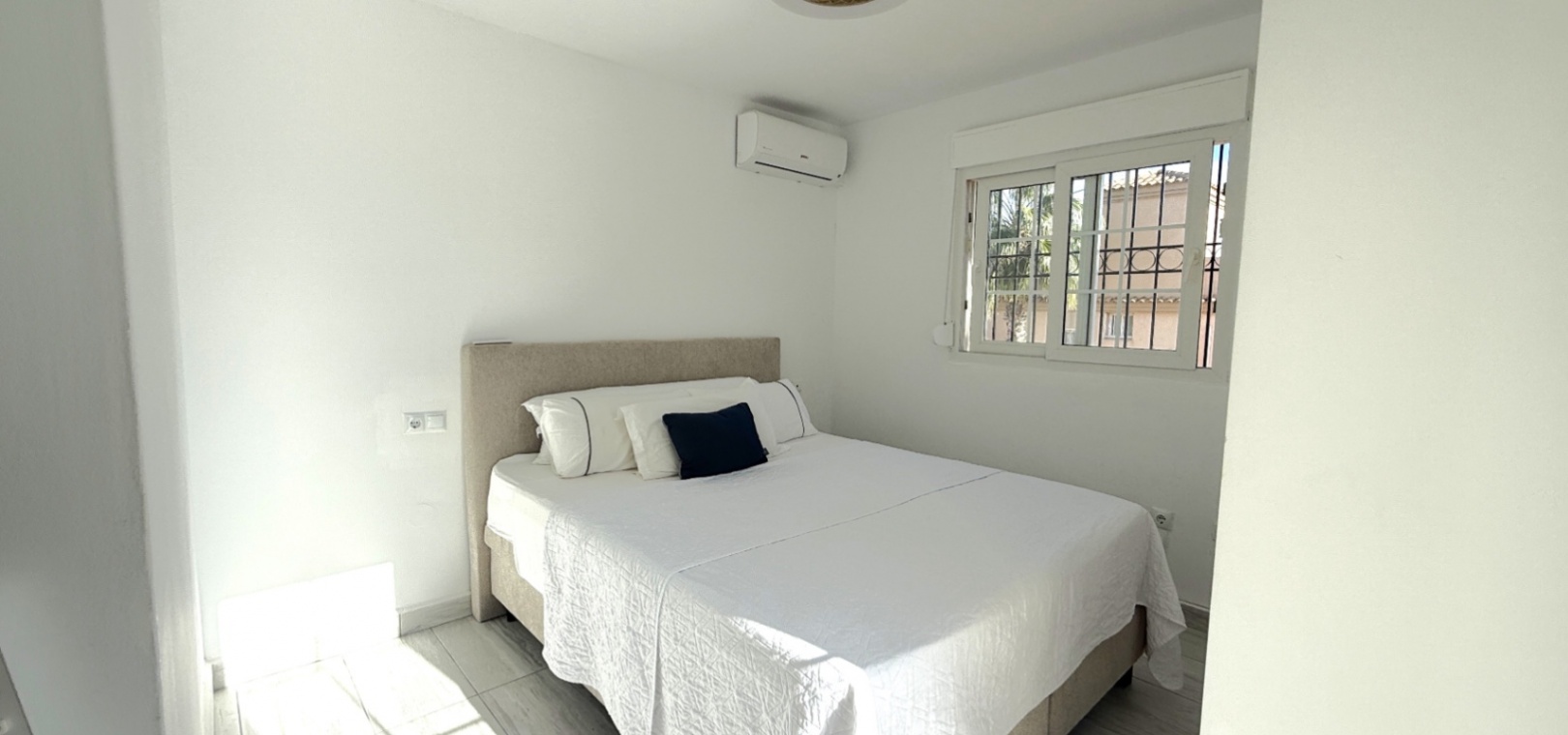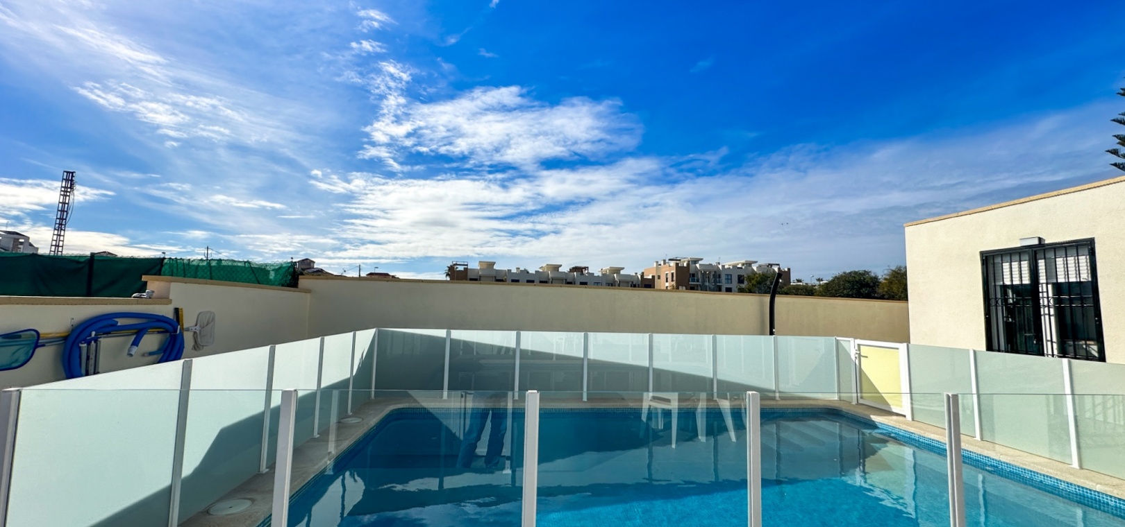 Fastigheten har 2 dubbelrum och 2 badrum, inklusive ett duschrum på bottenvåningen och ett familjebadrum på övervåningen – båda med elegant marmorkakel. Det ljusa vardagsrummet med öppen planlösning har ett modernt kök med spotlights och altandörrar som leder direkt till den privata uppvärmda poolen. För extra trygghet är poolområdet helt inglasat för att garantera säkerheten för barn och husdjur.