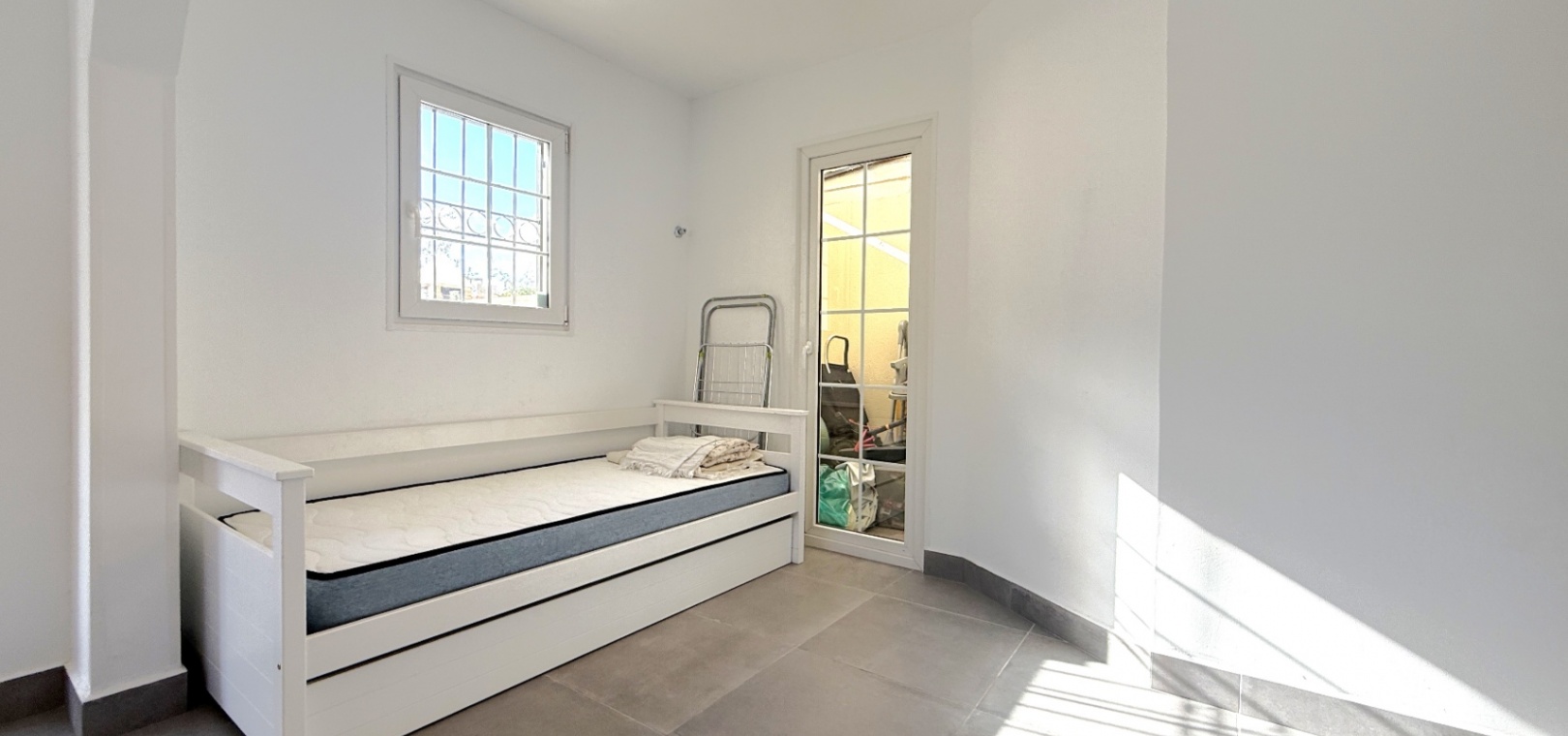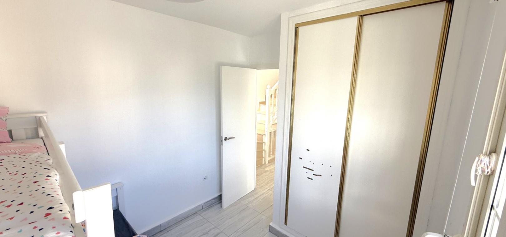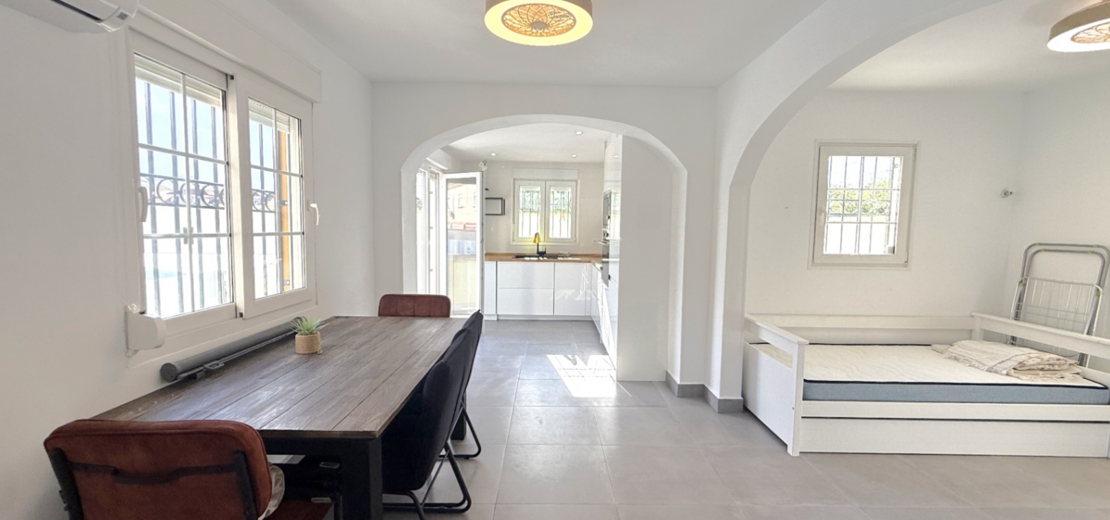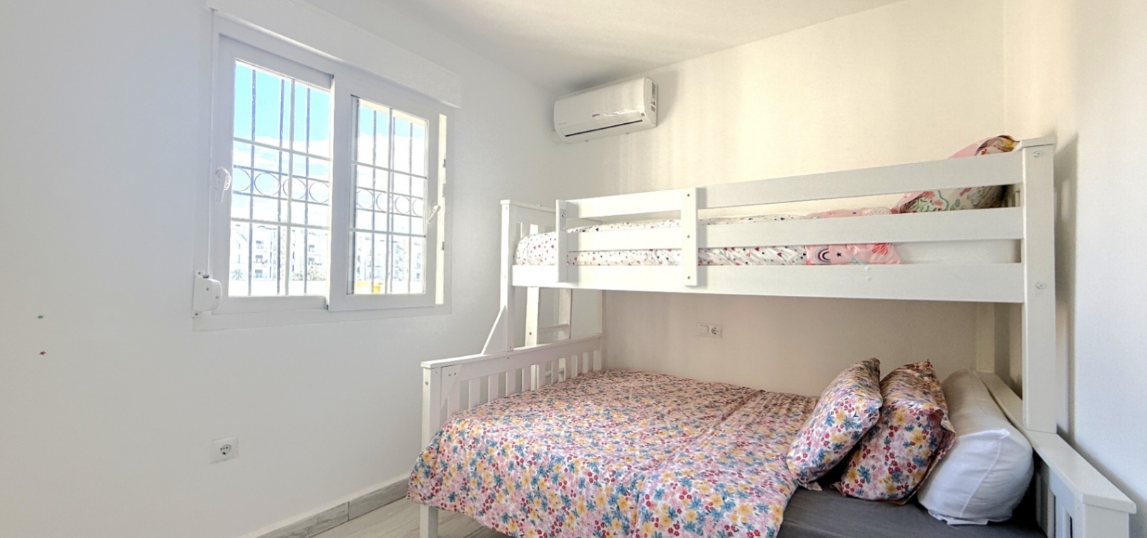 Fastigheten har 2 dubbelrum och 2 badrum, inklusive ett duschrum på bottenvåningen och ett familjebadrum på övervåningen – båda med elegant marmorkakel. Det ljusa vardagsrummet med öppen planlösning har ett modernt kök med spotlights och altandörrar som leder direkt till den privata uppvärmda poolen. För extra trygghet är poolområdet helt inglasat för att garantera säkerheten för barn och husdjur.