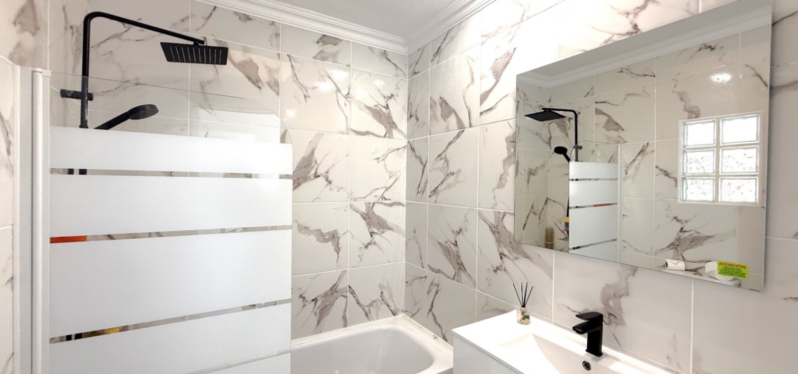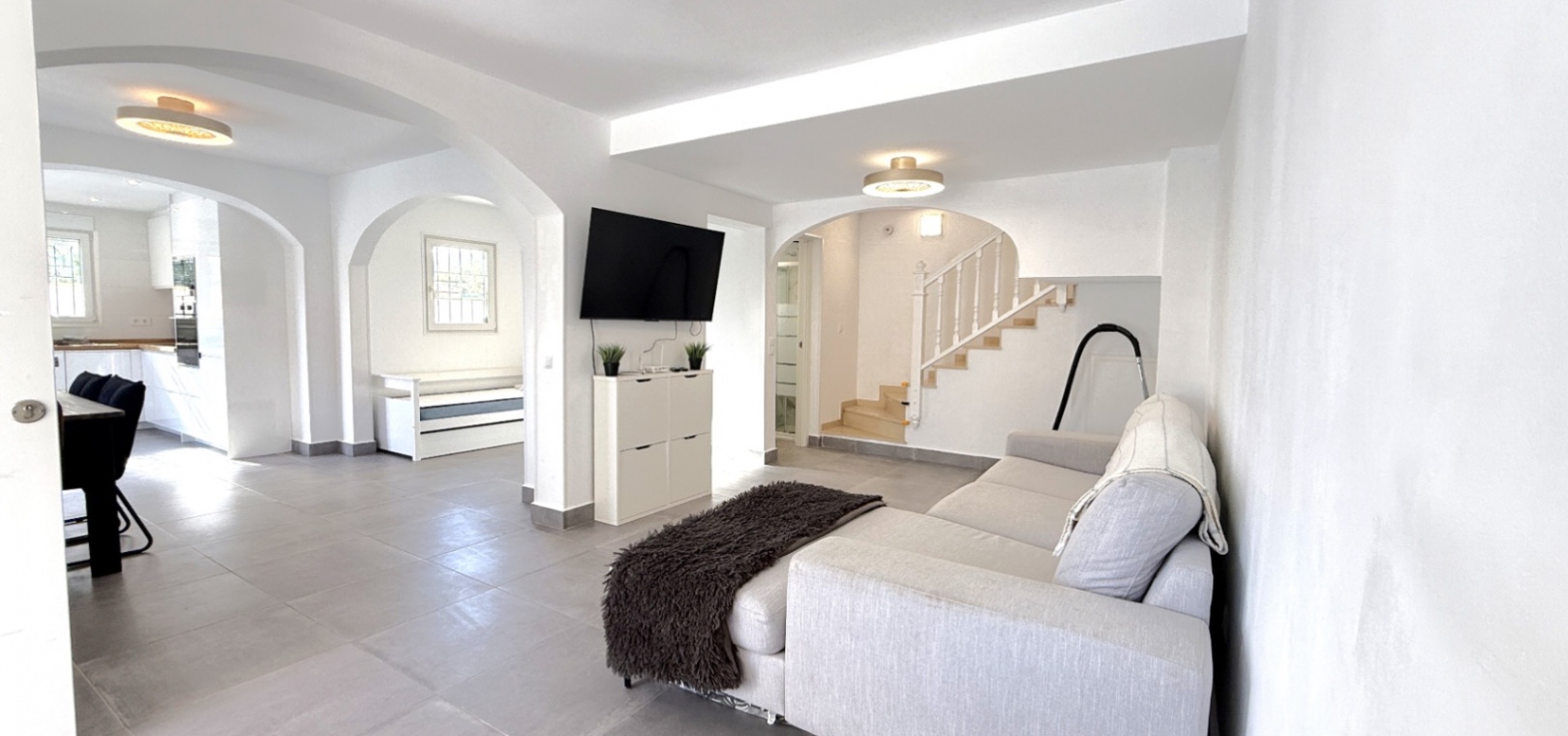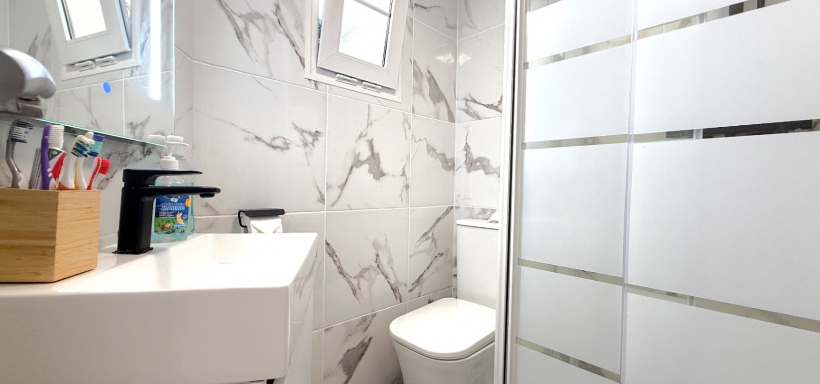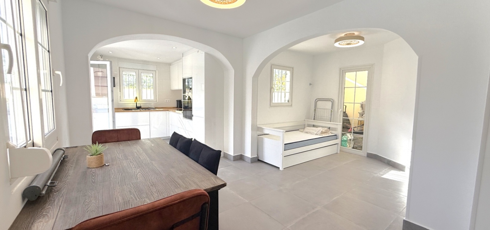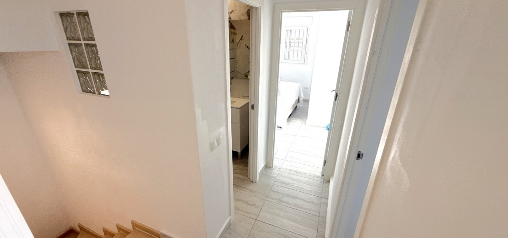 Fastigheten har 2 dubbelrum och 2 badrum, inklusive ett duschrum på bottenvåningen och ett familjebadrum på övervåningen – båda med elegant marmorkakel. Det ljusa vardagsrummet med öppen planlösning har ett modernt kök med spotlights och altandörrar som leder direkt till den privata uppvärmda poolen. För extra trygghet är poolområdet helt inglasat för att garantera säkerheten för barn och husdjur.