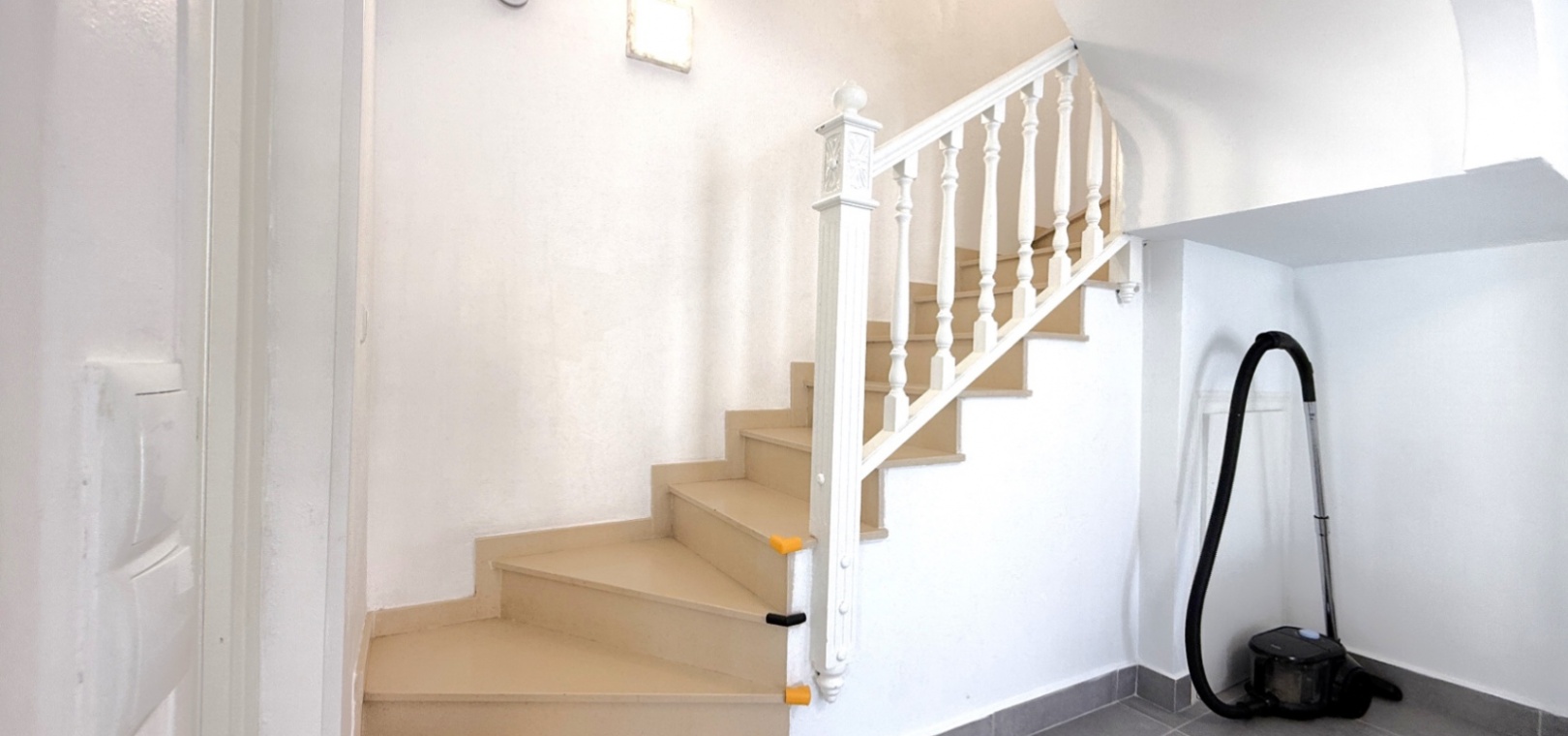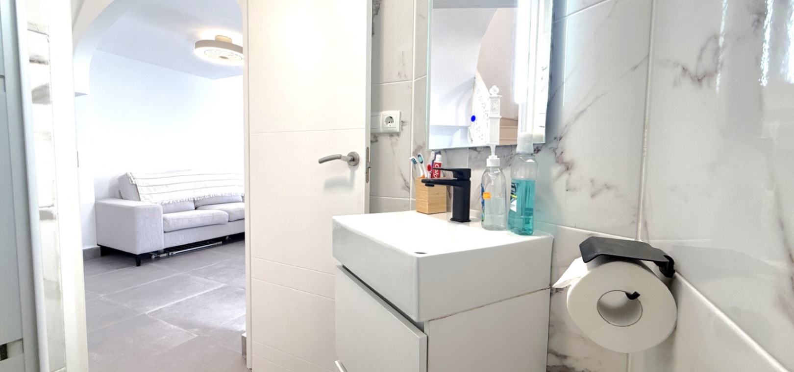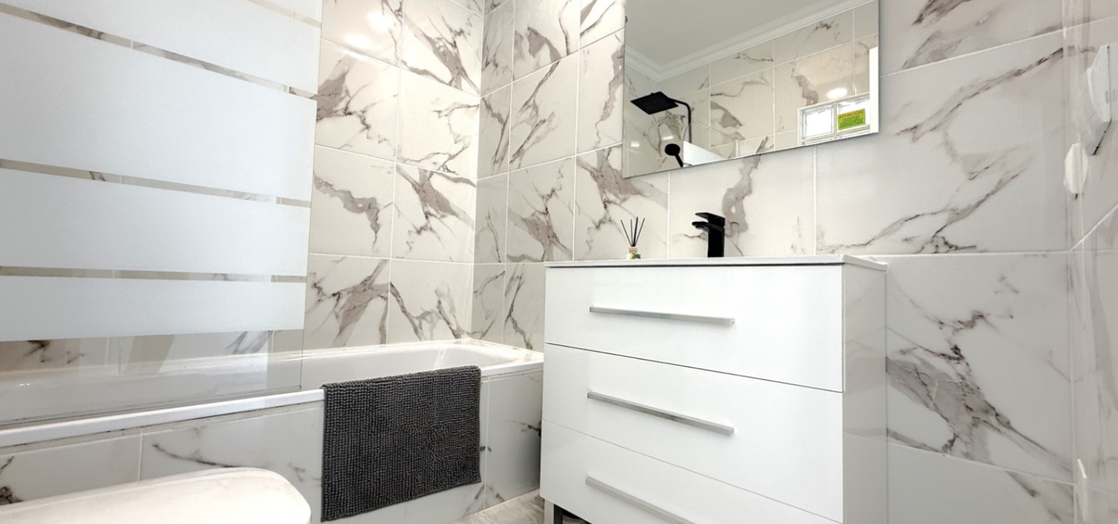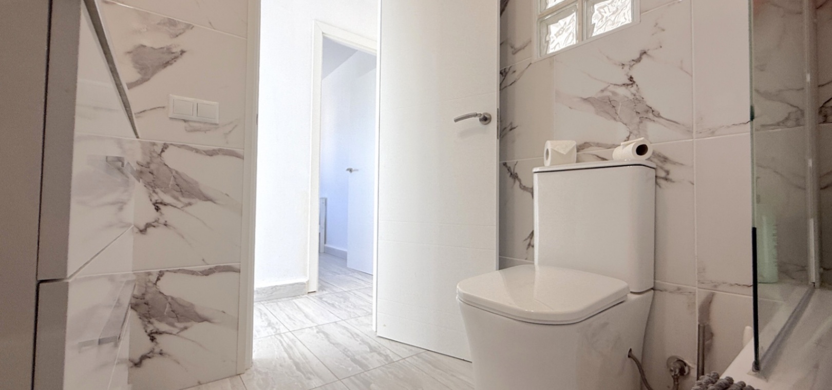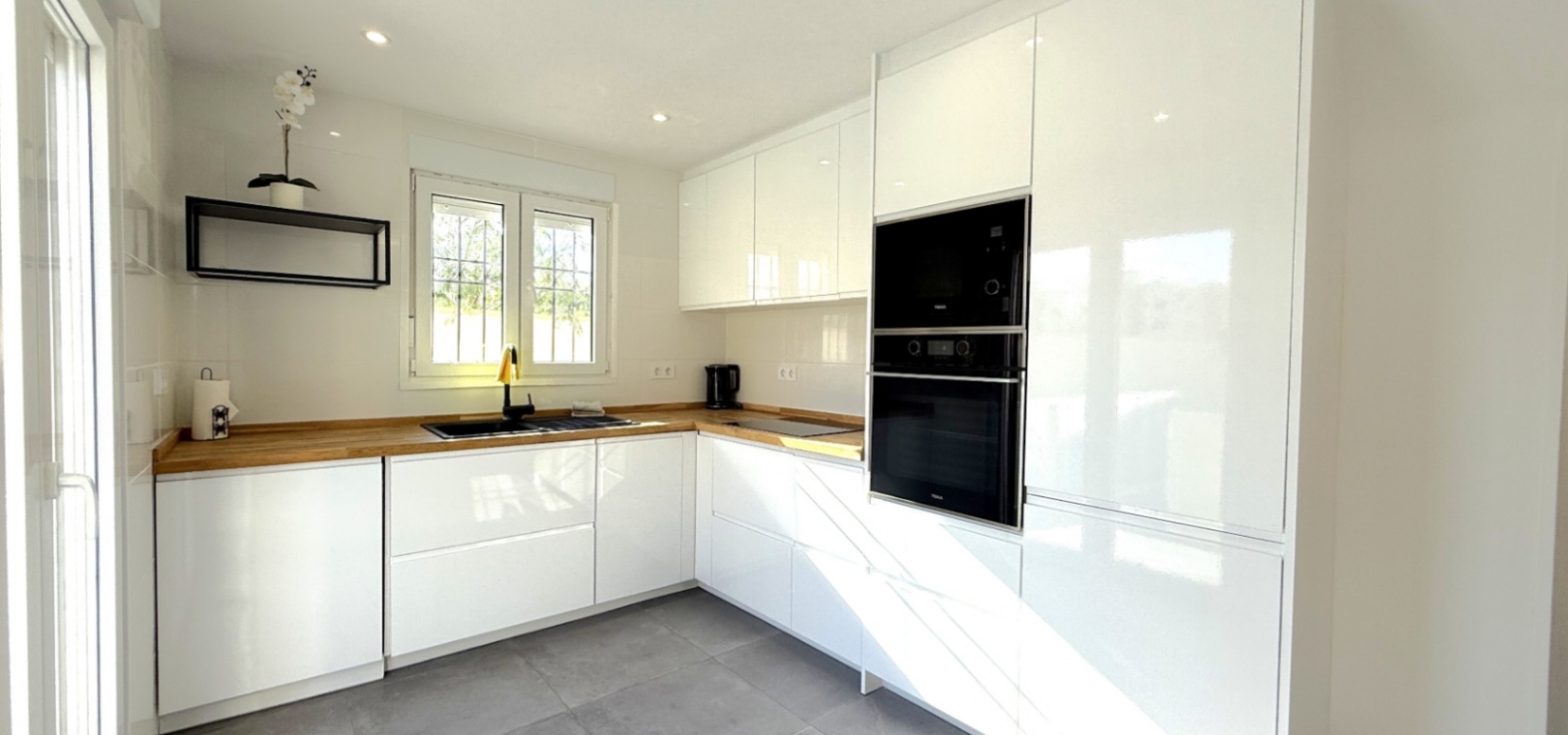 Fastigheten har 2 dubbelrum och 2 badrum, inklusive ett duschrum på bottenvåningen och ett familjebadrum på övervåningen – båda med elegant marmorkakel. Det ljusa vardagsrummet med öppen planlösning har ett modernt kök med spotlights och altandörrar som leder direkt till den privata uppvärmda poolen. För extra trygghet är poolområdet helt inglasat för att garantera säkerheten för barn och husdjur.