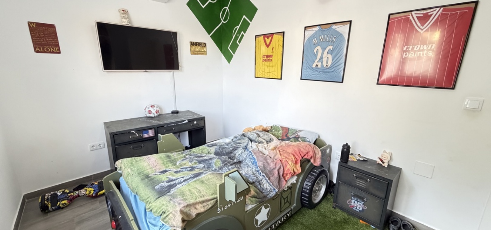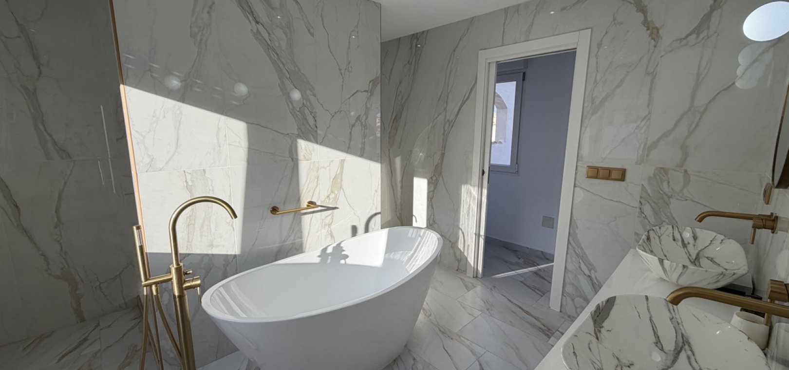Övervåningen är helt tillägnad en rymlig mastersvit med ett lyxigt badrum med både badkar och duschkabin, tillsammans med en stor klädkammare som enkelt kan omvandlas till ett sjätte sovrum – vilket skapar en verkligt privat tillflyktsort.