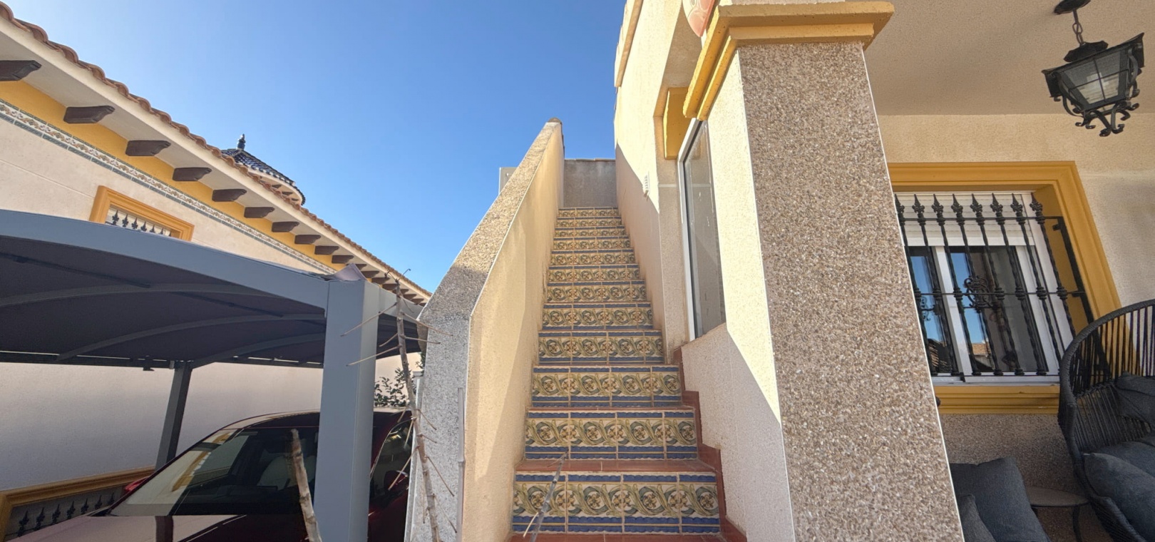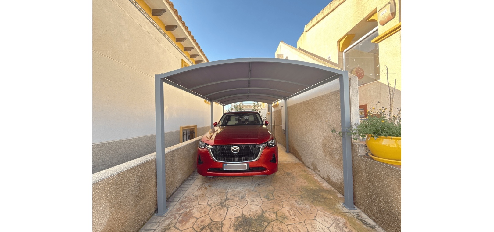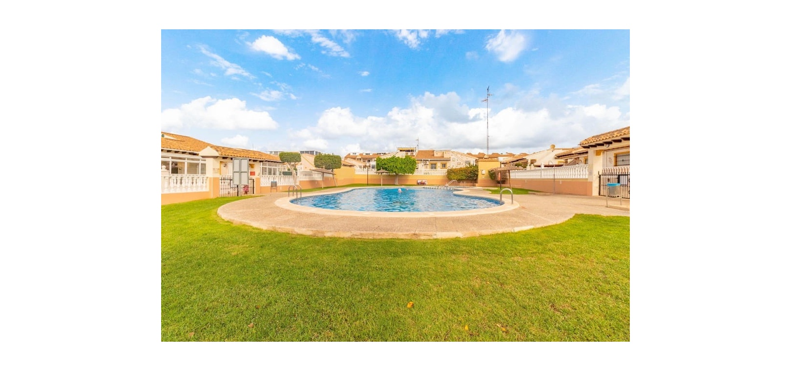 Ytterligare bekvämligheter inkluderar en privat carport , en ovanlig bekvämlighet för bungalows i detta område, och tillgång till en välskött gemensam pool och trädgård , perfekt för avkoppling och umgänge.