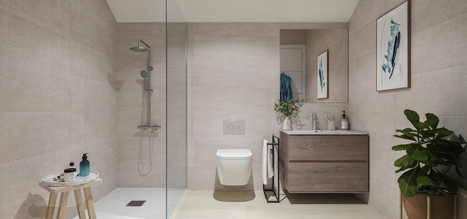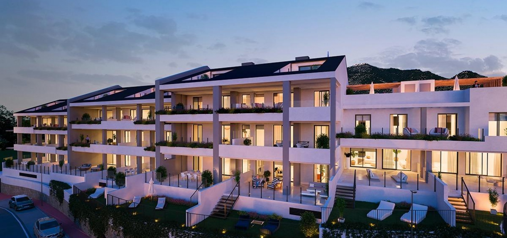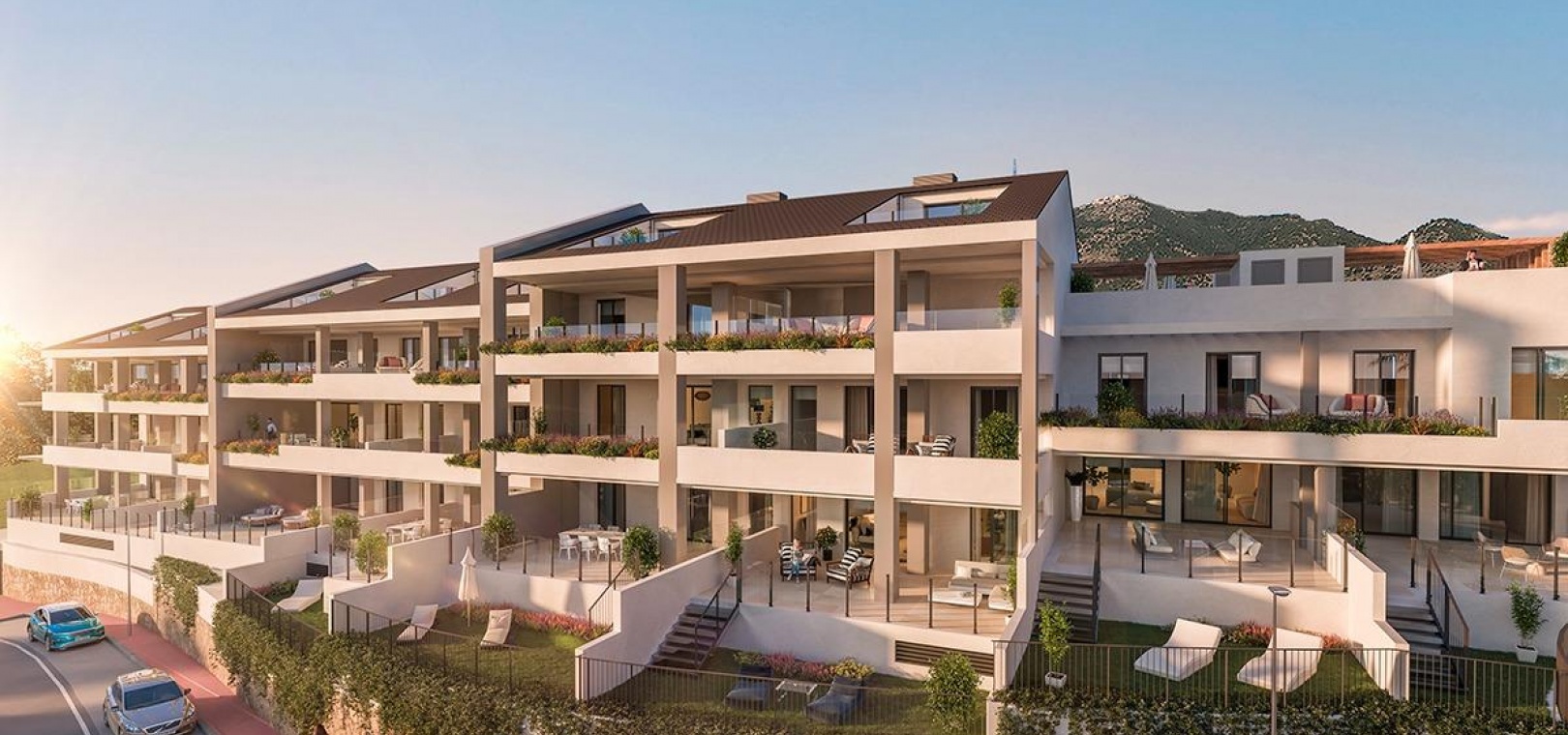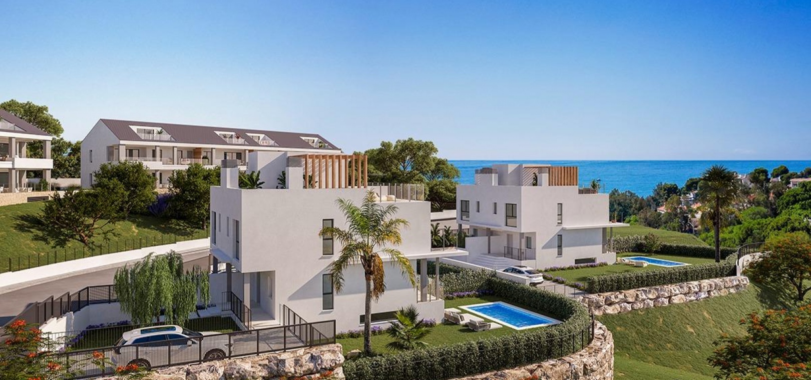 Bostadsområdet består av 44 moderna bostäder med 2 och 3 sovrum, alla med två privata parkeringsplatser och ett förråd. Välj mellan rymliga lägenheter med stora terrasser, takvåningar med privata solterrasser eller radhus och parhus med stora privata trädgårdar och, i vissa enheter, källare för extra flexibilitet. Alla bostäder är utformade för att maximera det naturliga ljuset och har sydost- eller sydvästläge för att njuta av den fantastiska havsutsikten året om.