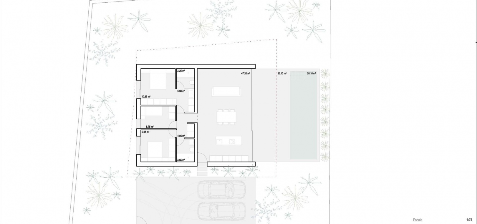 Det rymliga vardagsrummet och matplatsen ansluter direkt till en 26 m2 stor terrass och privat pool, vilket skapar ett sömlöst flöde mellan inomhus och utomhus som omfamnar den medelhavsinspirerade livsstilen. Utomhusområdet är perfekt för att koppla av, äta middag eller njuta av det soliga klimatet året om.