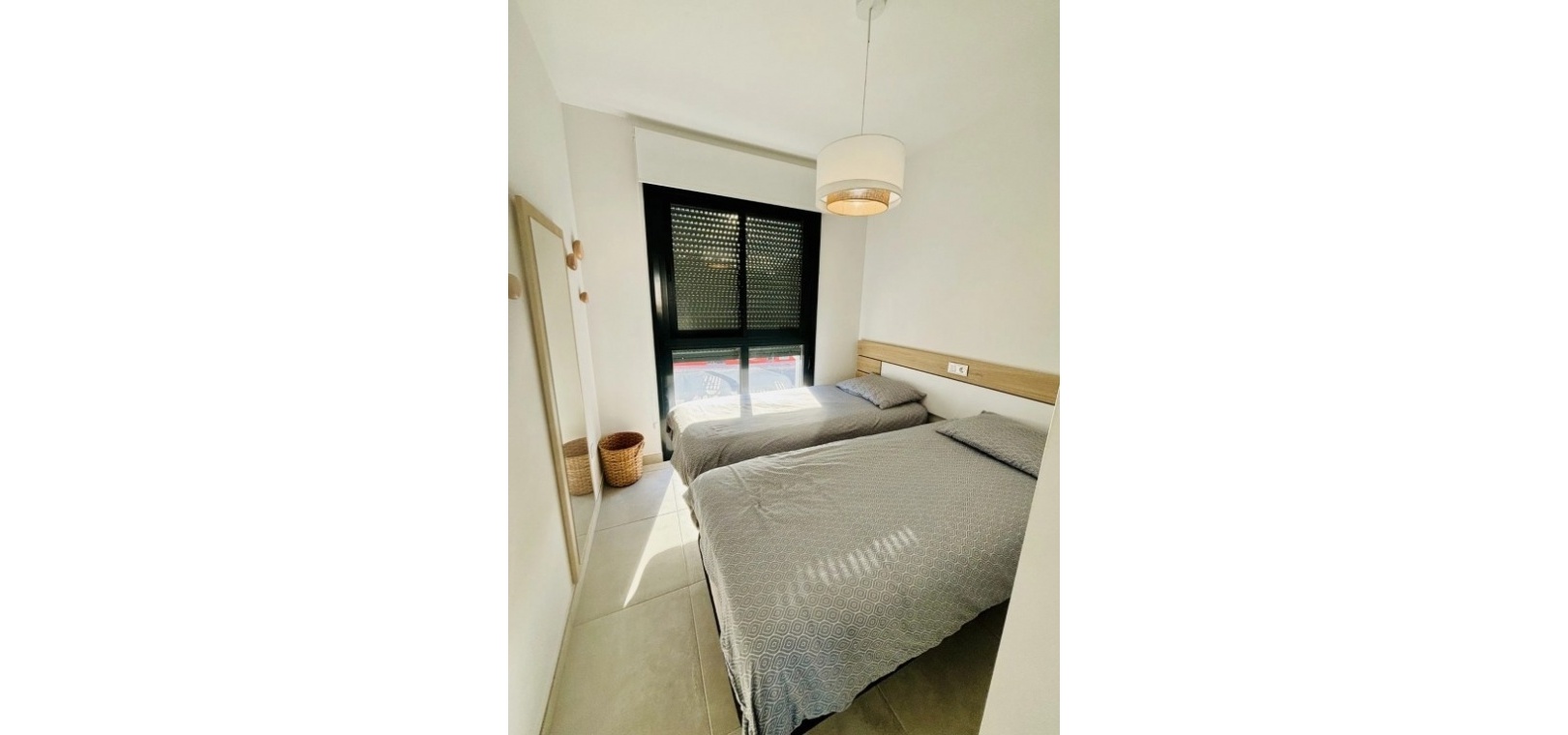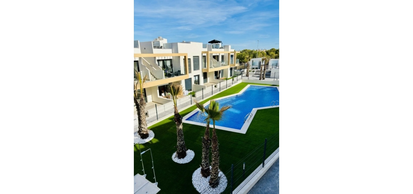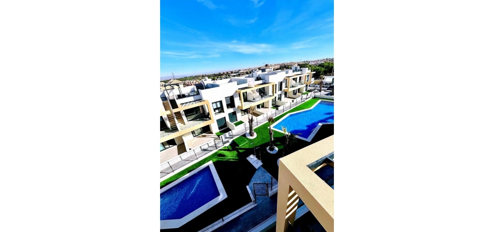 Fastigheten erbjuder en ljus och modern planlösning med två rymliga sovrum och två badrum, inklusive ett master bedroom med eget badrum. Vardagsrummet med öppen planlösning är fyllt med naturligt ljus och ansluter sömlöst till en privat terrass med utsikt över den gemensamma poolen och omgivningarna, vilket skapar en avkopplande och inbjudande atmosfär.