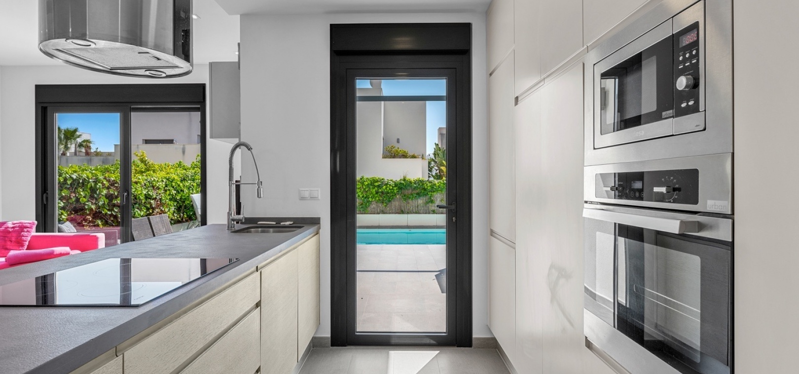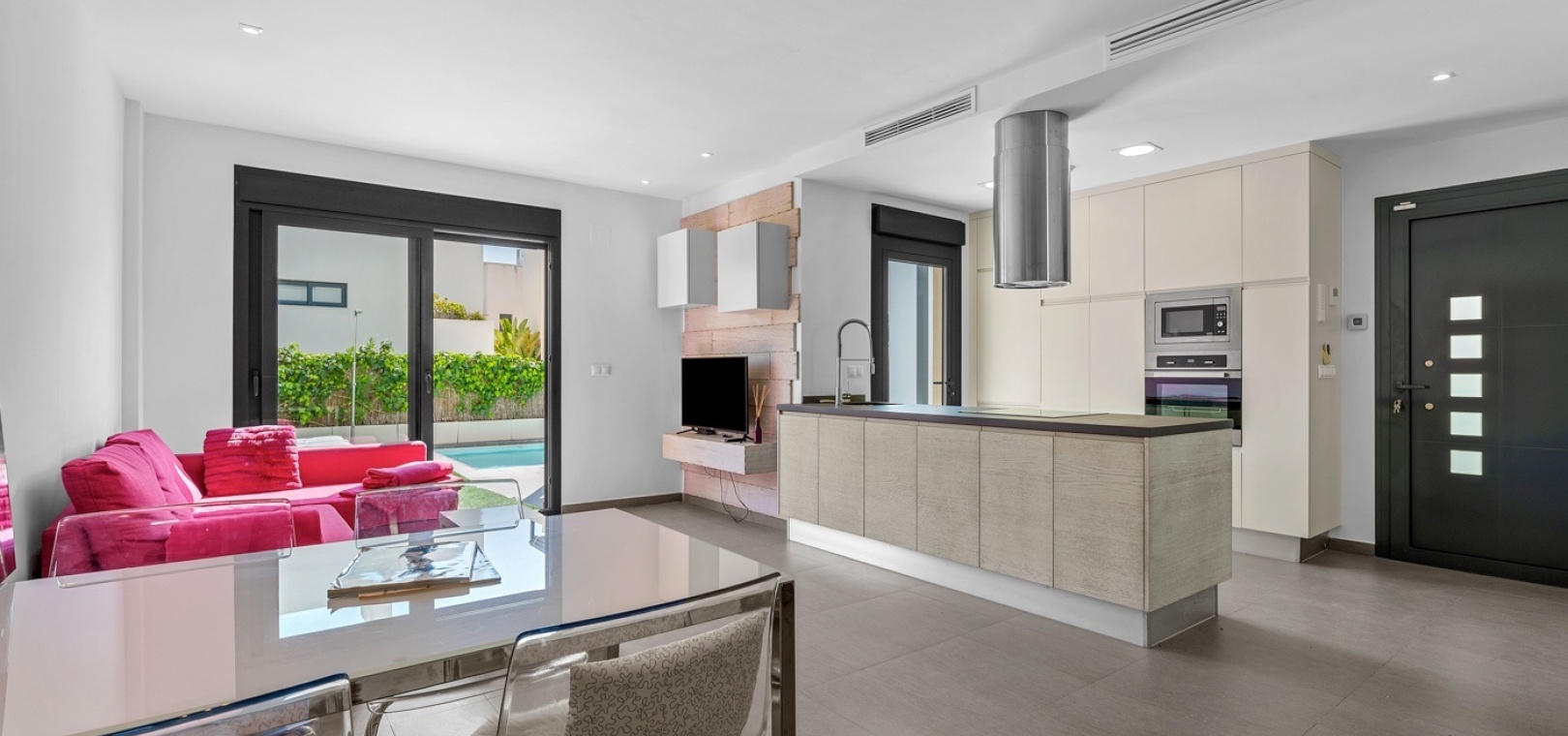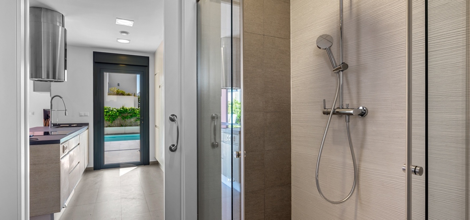 På bottenvåningen erbjuder villan en modern öppen planlösning med ett fullt integrerat kök i anslutning till ett rymligt och ljust vardagsrum. Denna våning är idealisk för både vardagsliv och underhållning, och inkluderar även ett komplett badrum.