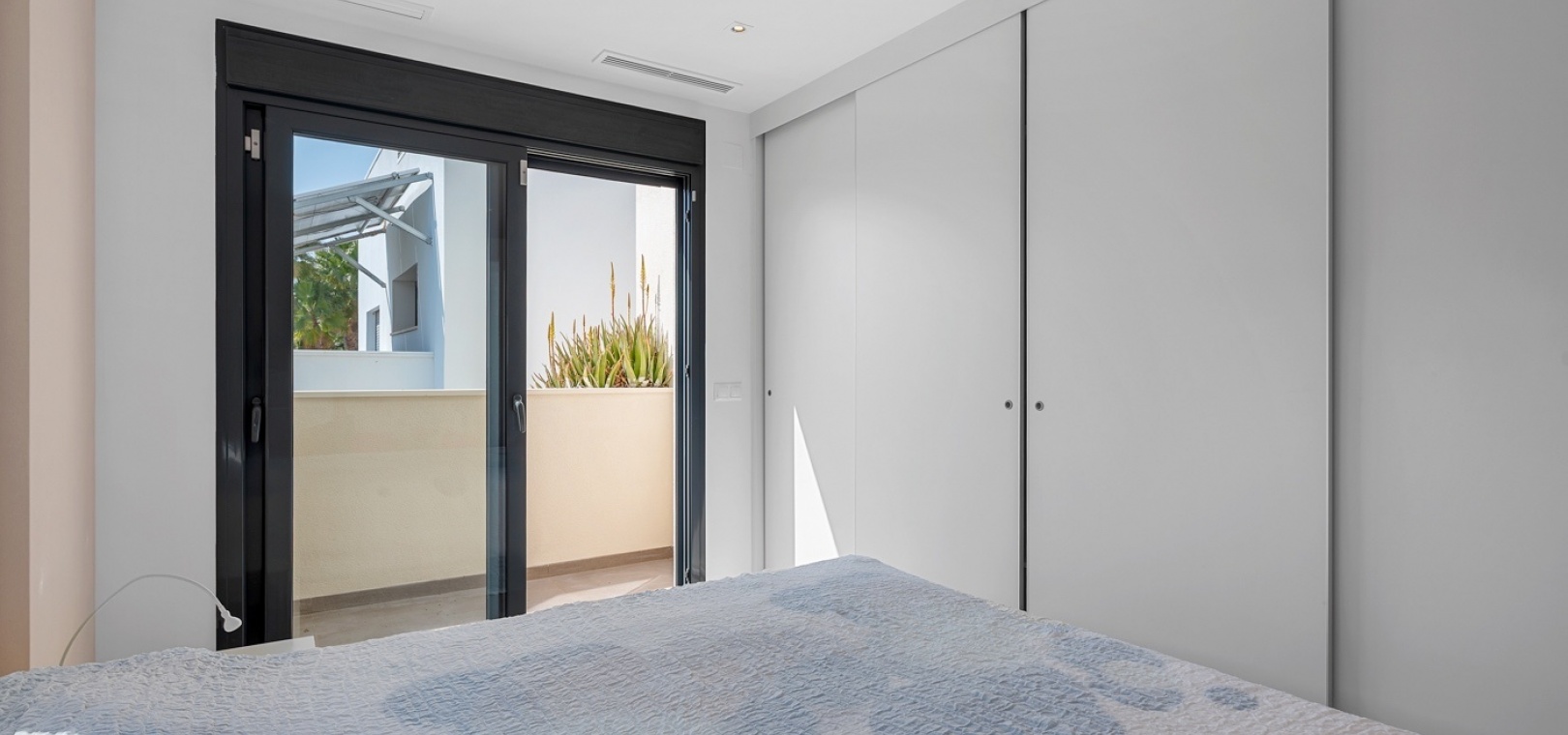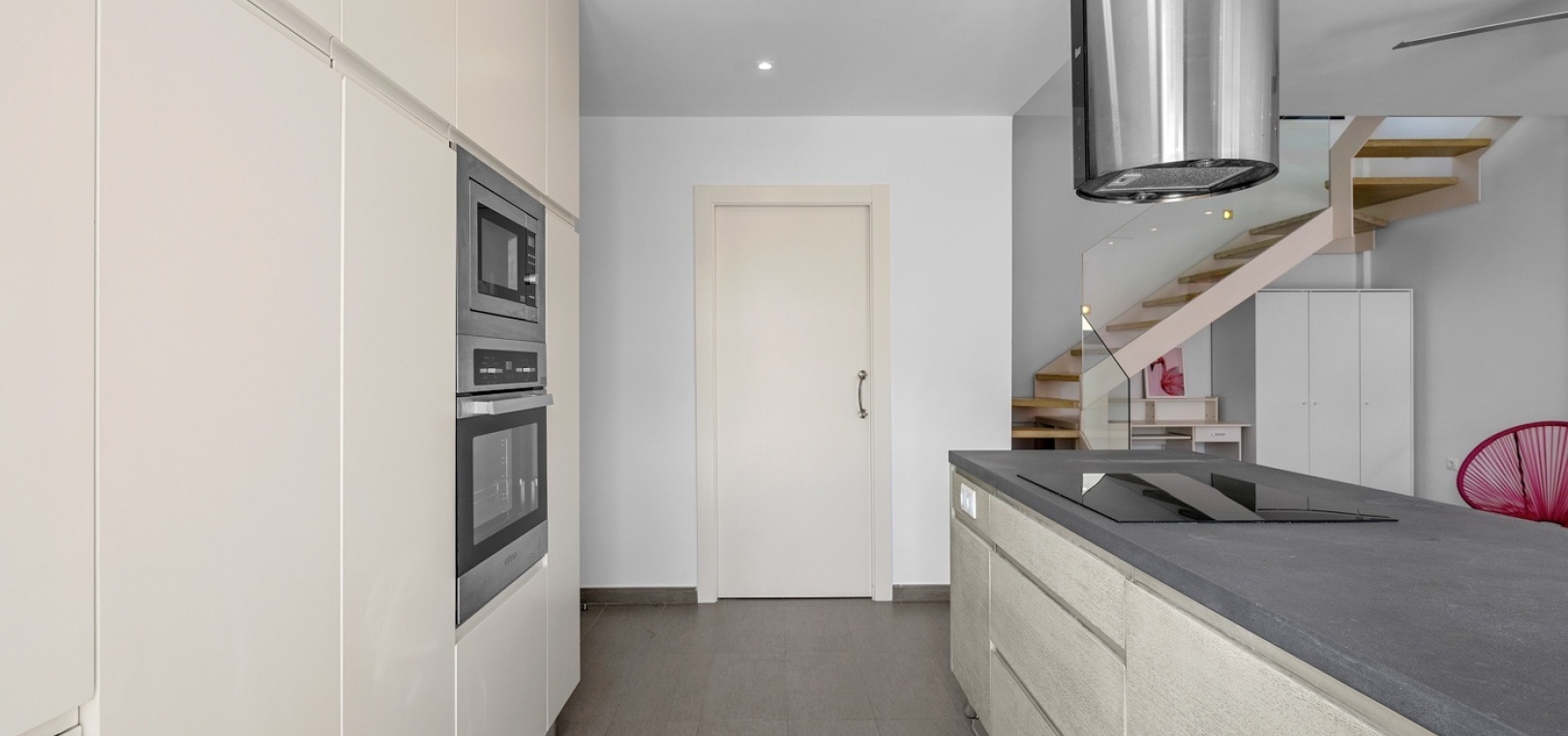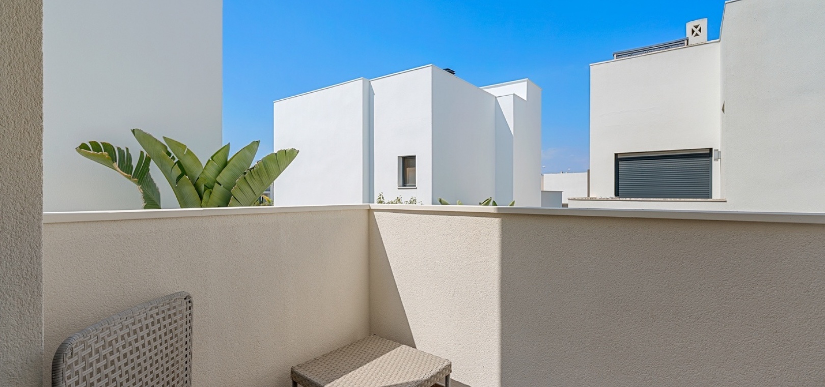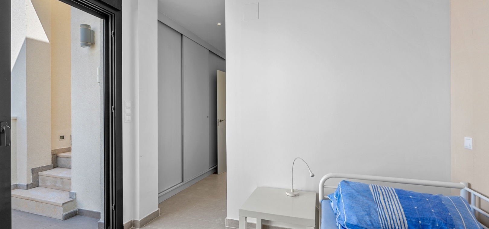 Första våningen består av två sovrum med dubbelsäng och ett andra badrum. Det stora sovrummet har tillgång till en privat balkong, medan gästrummet också har en egen balkong. Härifrån leder trappor upp till ett fantastiskt privat solarium, en av fastighetens mest framträdande funktioner, som erbjuder öppen utsikt och en perfekt miljö för avkoppling, solbad eller att njuta av uteservering.