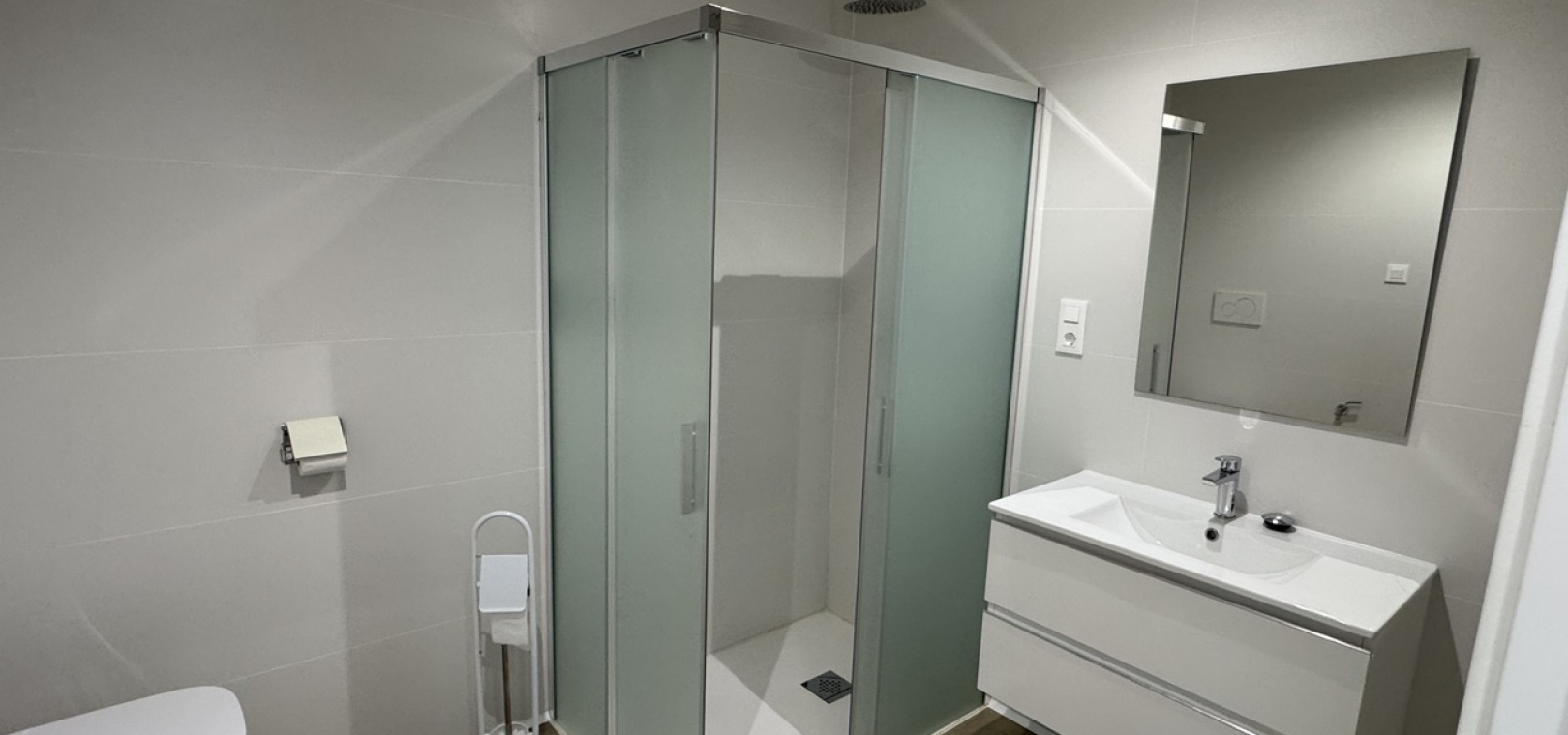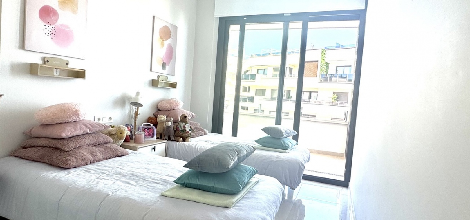 Inuti har bostaden ett ljust, modernt vardagsrum med öppen planlösning, utformat för både komfort och stil. Det stora sovrummet har ett eget badrum, medan ytterligare två dubbelrum delar ett modernt familjebadrum, vilket gör bostaden idealisk för familjer, gäster eller distansarbete.