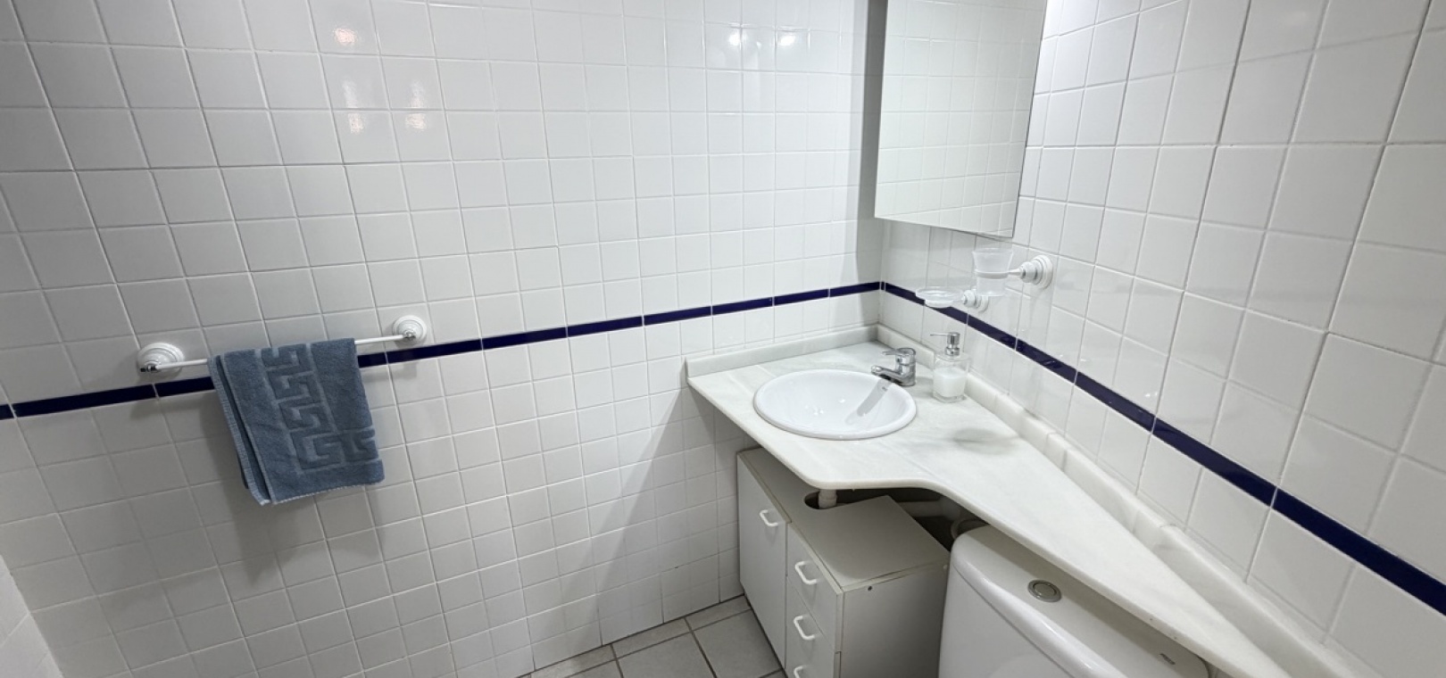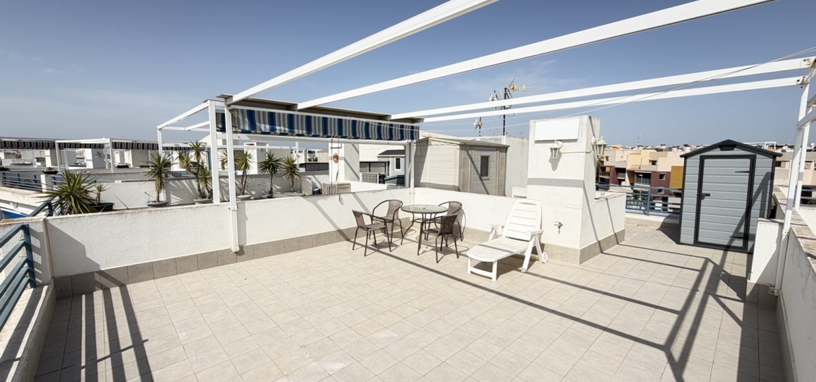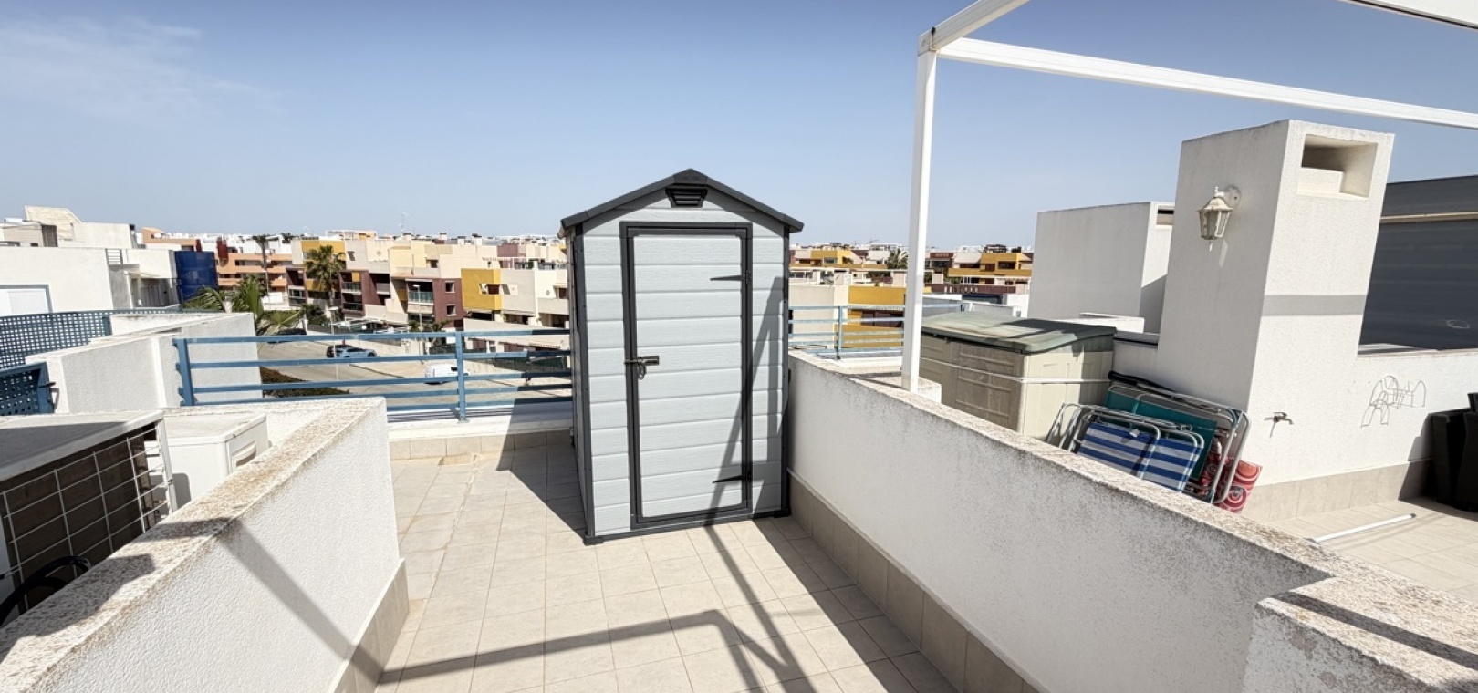 Fastigheten har två rymliga sovrum, båda med eget badrum, vilket ger utmärkt avskildhet och bekvämlighet. Det ljusa vardagsrummet med öppen planlösning leder ut mot en privat balkong, medan det mest framträdande är det stora solrummet på taket – perfekt för solbad, middagar eller underhållning året runt i Costa Blanca-klimatet.