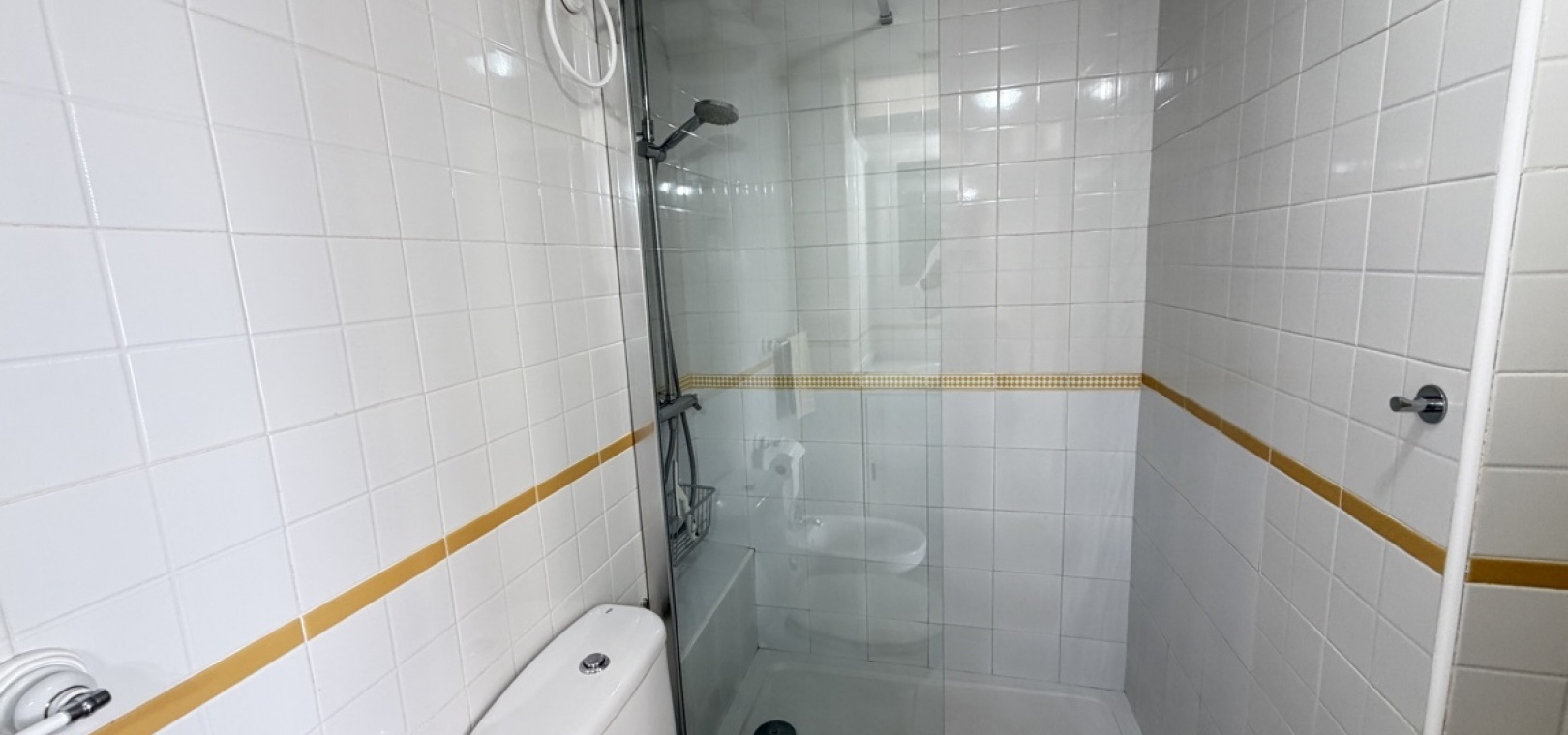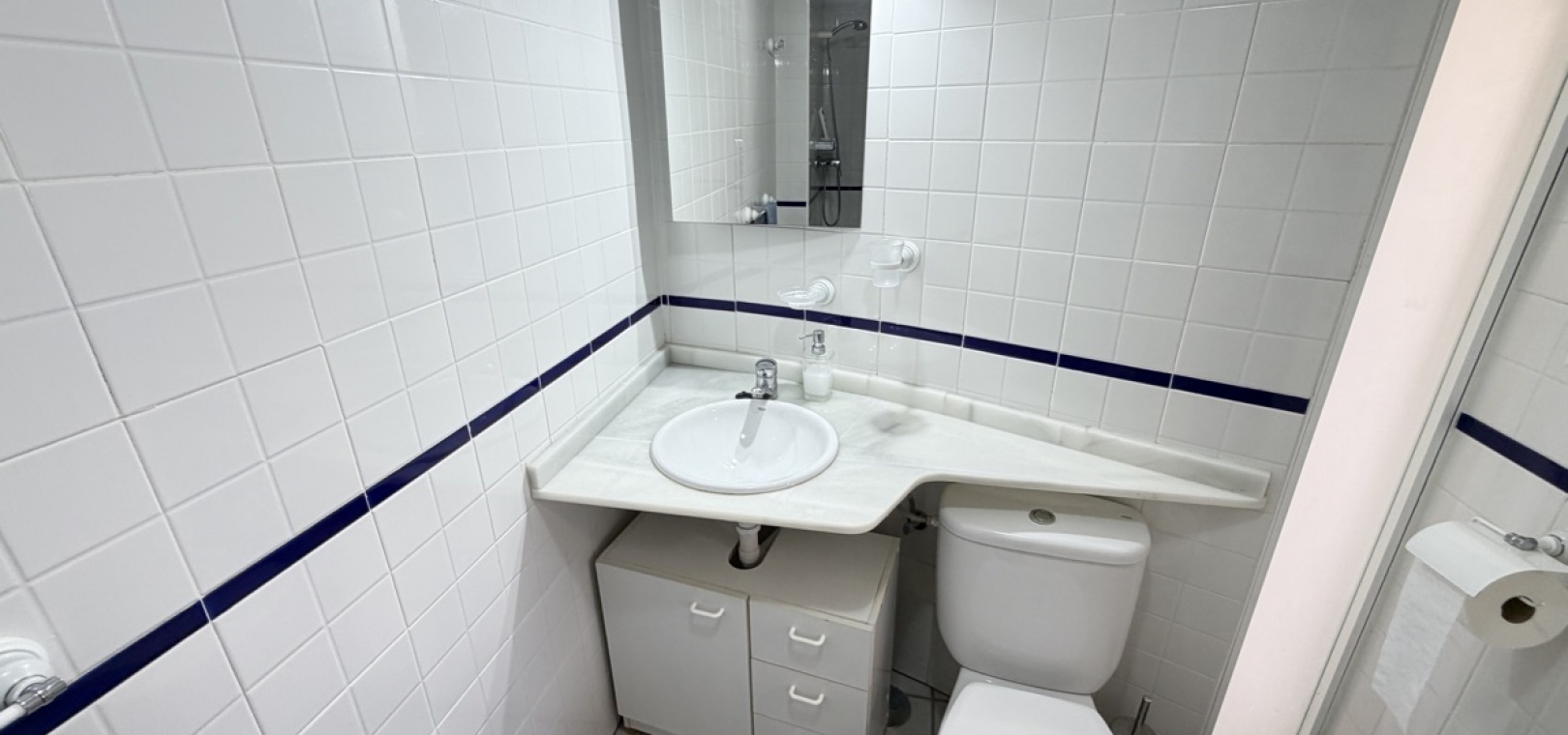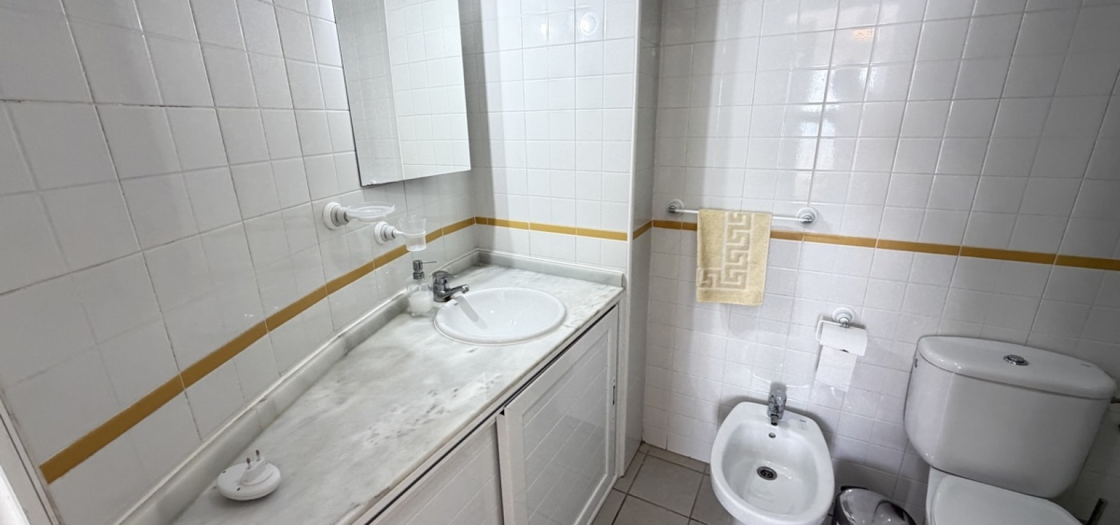 Fastigheten har två rymliga sovrum, båda med eget badrum, vilket ger utmärkt avskildhet och bekvämlighet. Det ljusa vardagsrummet med öppen planlösning leder ut mot en privat balkong, medan det mest framträdande är det stora solrummet på taket – perfekt för solbad, middagar eller underhållning året runt i Costa Blanca-klimatet.