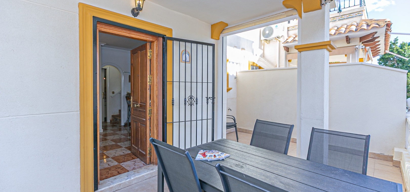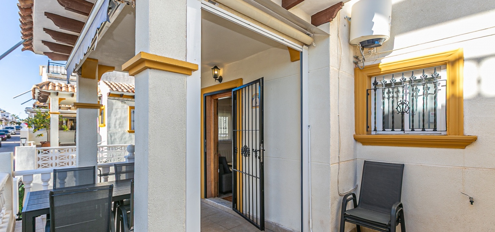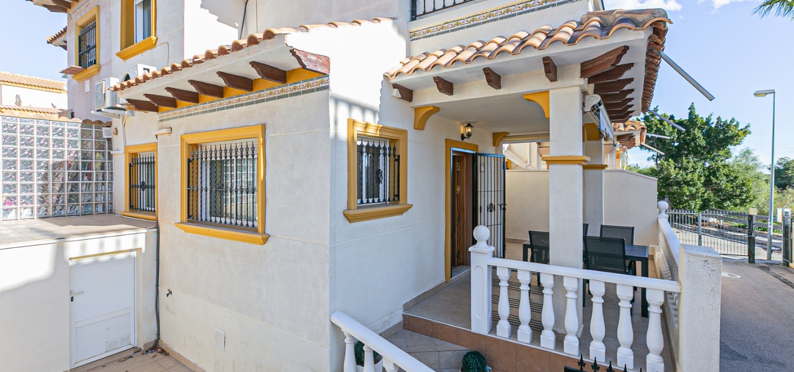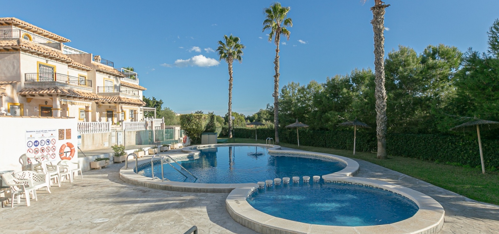 Till salu: Charmigt fyrbäddshus i söderläge beläget mellan La Zenia och Playa Flamenca, i ett gated bostadsområde med gemensam pool.