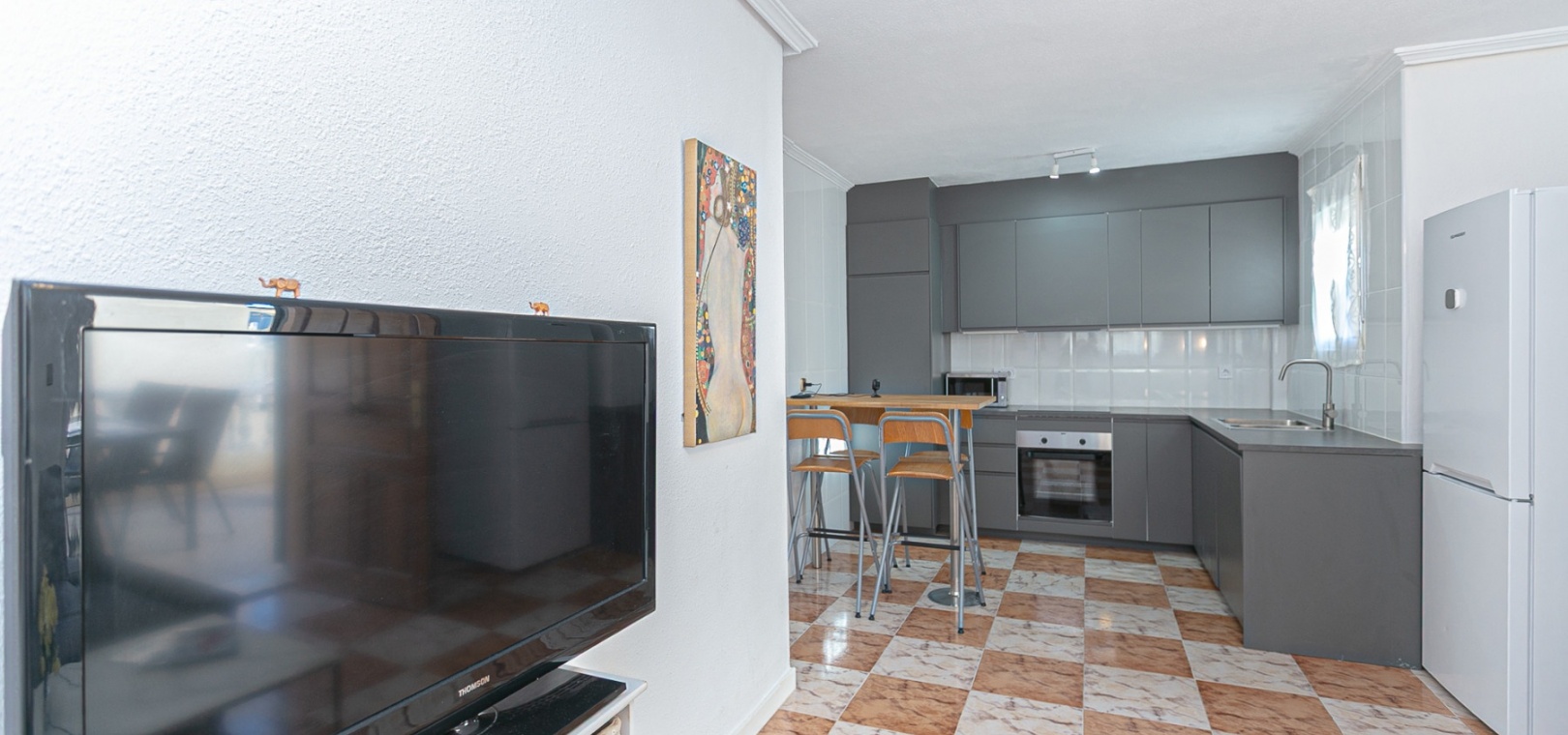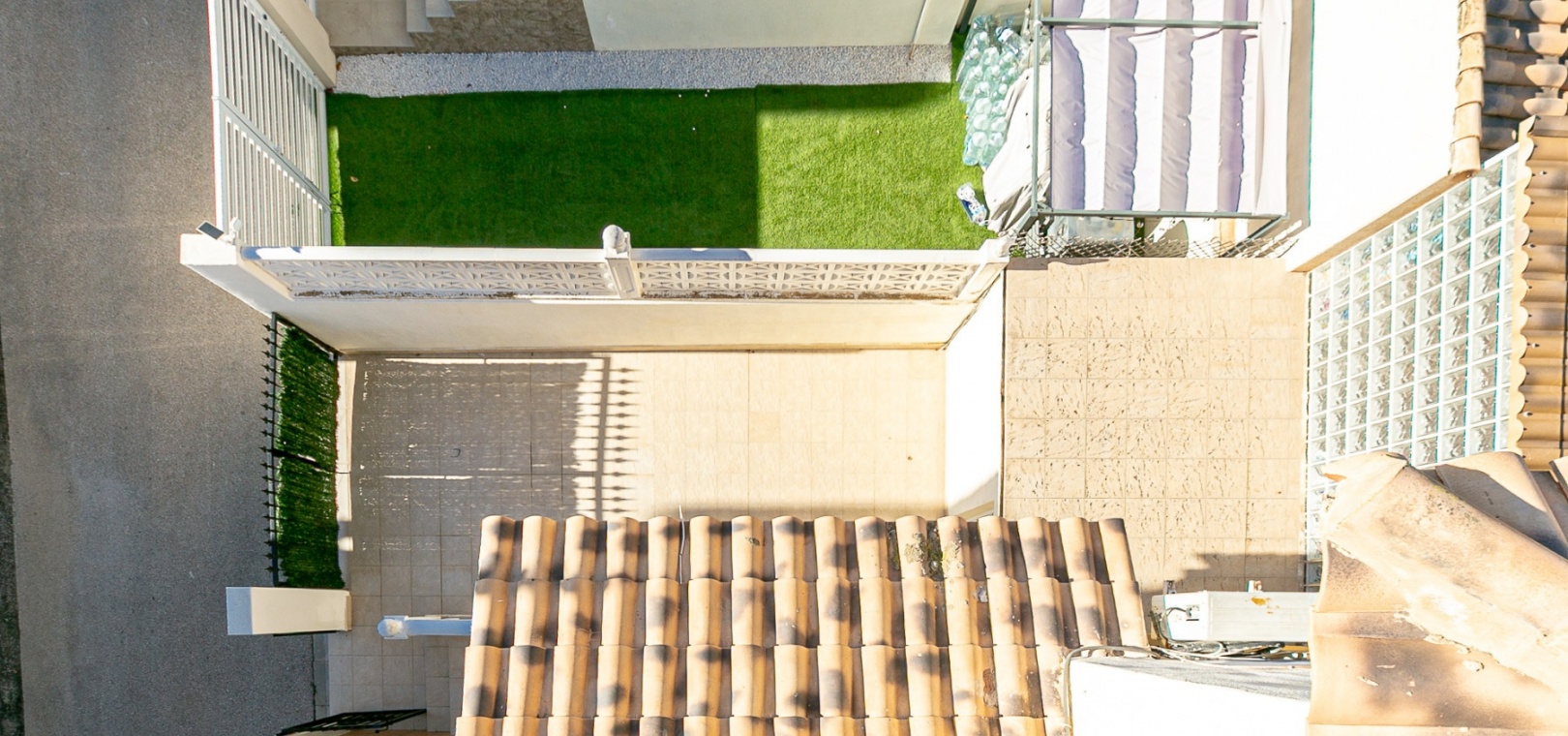 Åtkomst sker via en trappa som leder till en terrass med markiser, vilket ger en bekväm uteplats. Interiören består av ett ljust vardagsrum i anslutning till ett helrenoverat modernt kök med frukostbar.