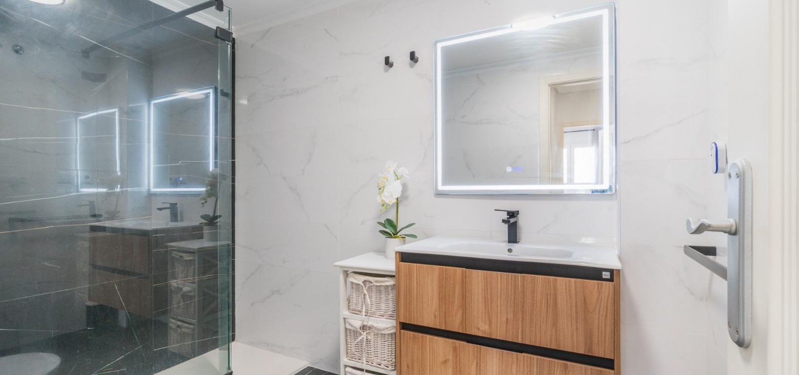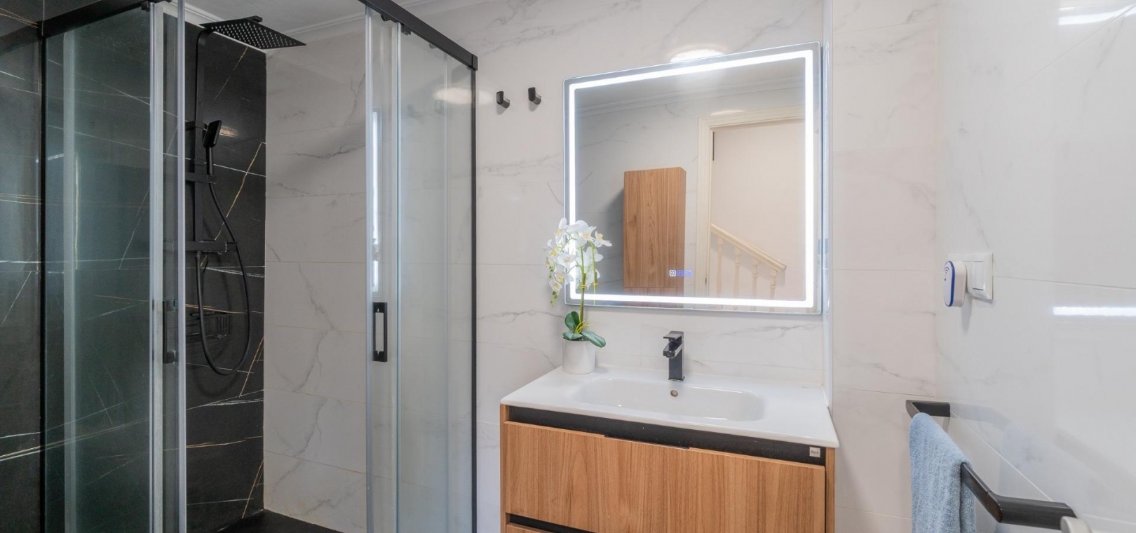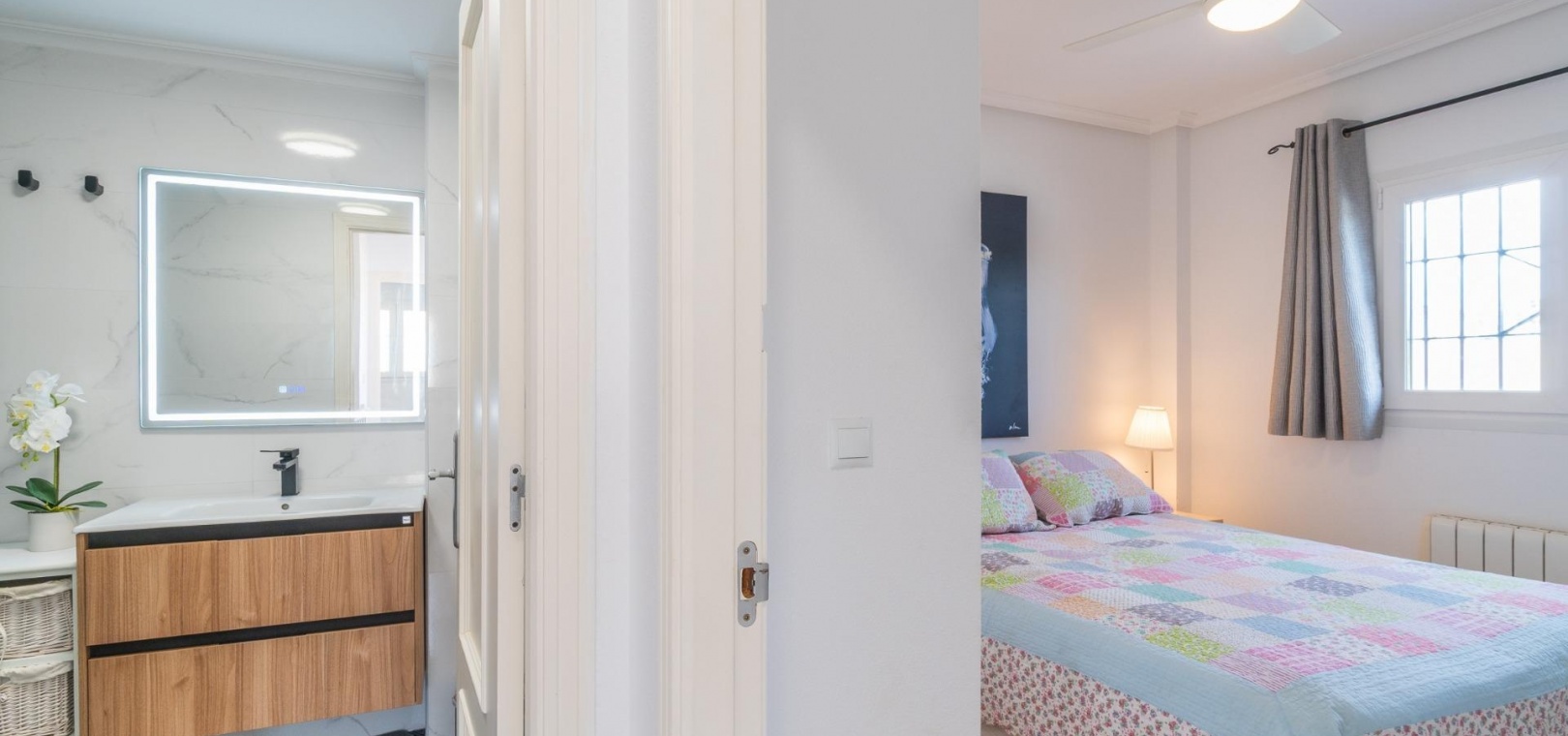 På första våningen finns ytterligare två sovrum, ett andra renoverat badrum och tillgång till en privat terrass.