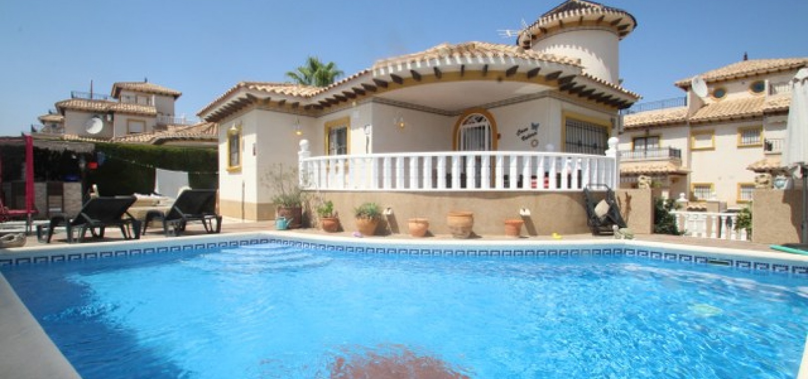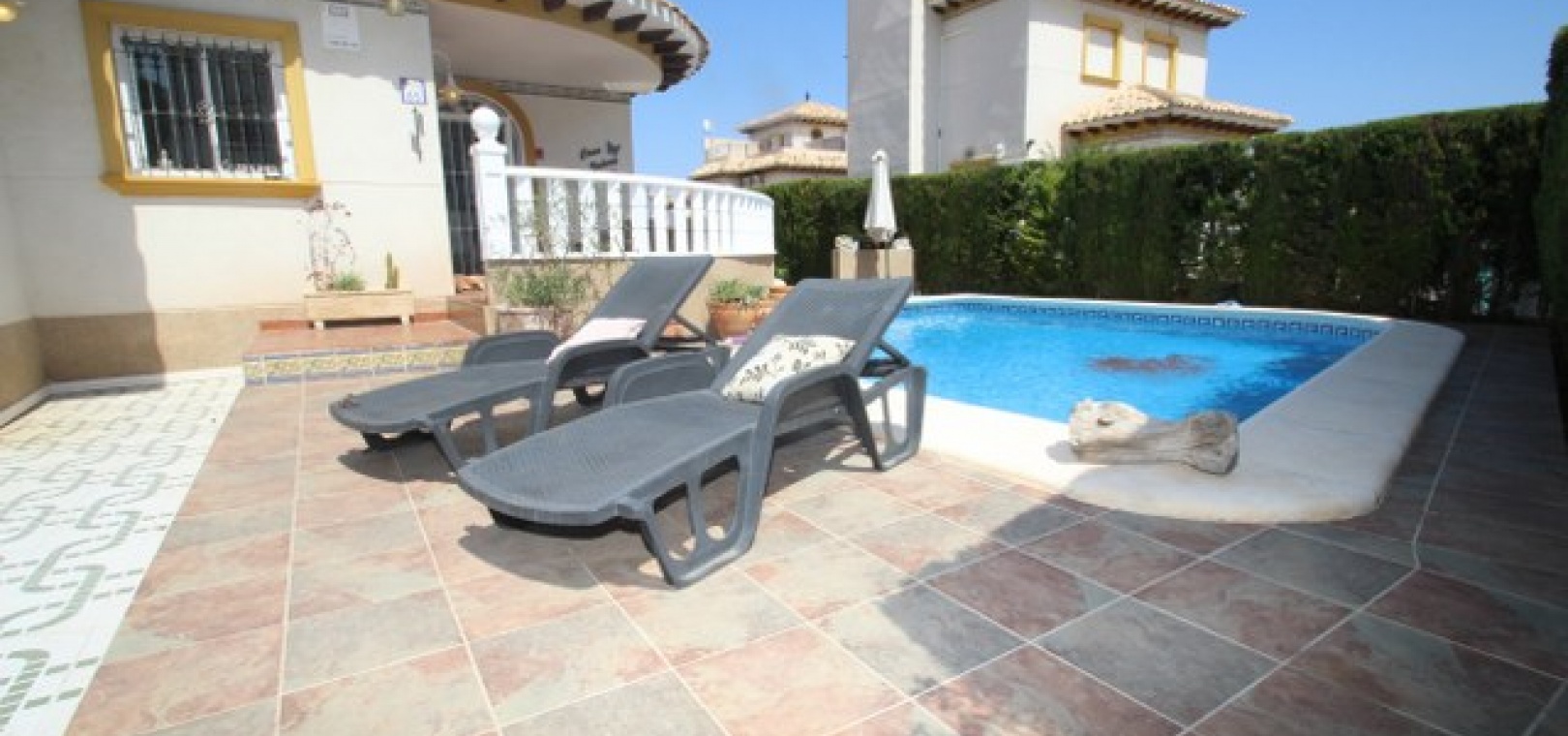 En fristående villa med 2 sovrum och 2 badrum med privat pool belägen i Pinada Golf II, Villamartin, Costa Blanca.