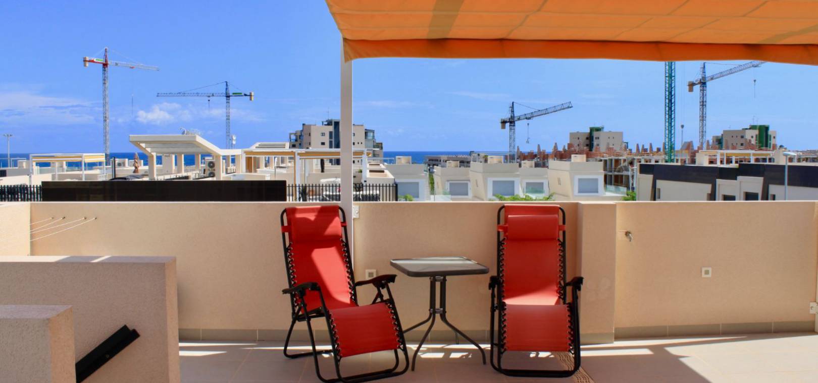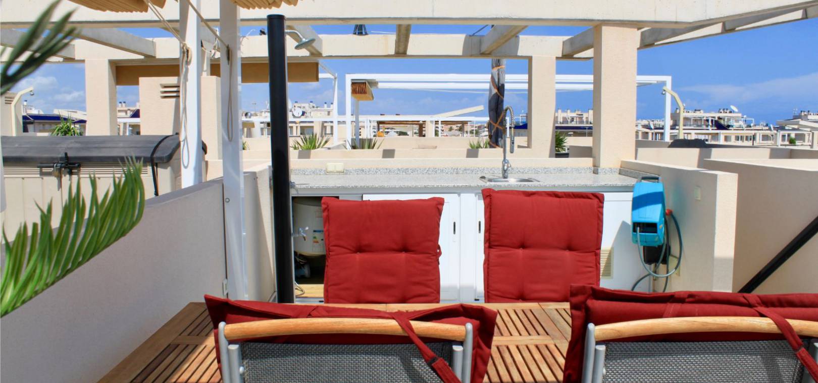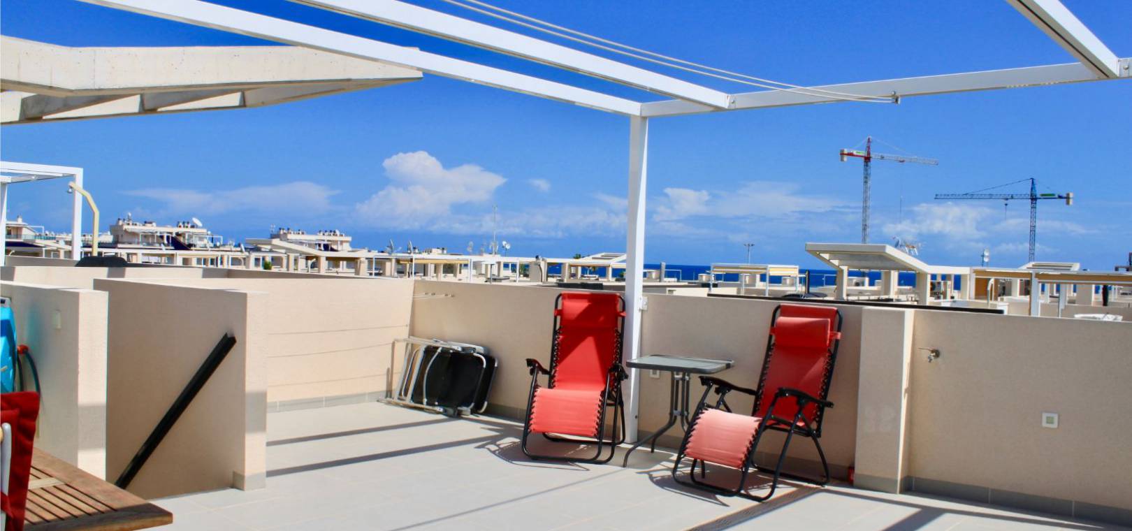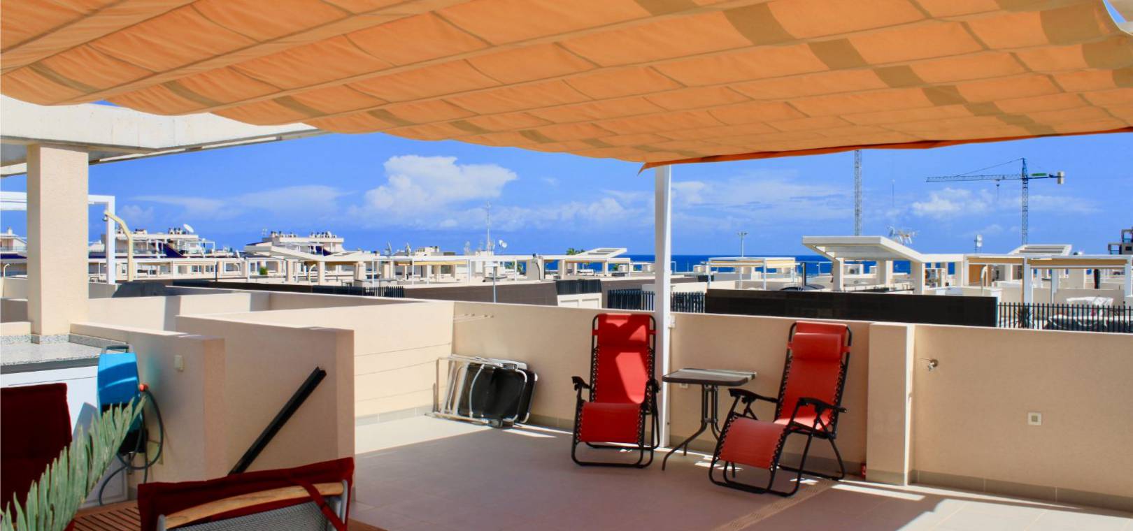 En lägenhet i söderläge med 2 sovrum och 2 badrum på översta våningen med ett privat solarium på taket i Playa Elisa Bay II, Mil Palmeras, Costa Blanca. Denna underbara fastighet erbjuds till salu i utmärkt skick och består mycket kort av följande: - Ljus och luftig solstol / matsal, fullt utrustat kök med öppen planlösning, 2 x dubbelrum med inbyggda garderober, master med eget duschrum, 1 x familj duschrum, balkong, stort privat takterrass, gemensam pool, barnpark, gemensam parkering och mycket mer. Fastigheten ligger bara några minuters promenad till stranden och lokala barer, butiker och restauranger. Den här fastigheten ligger bara 30 minuters bilresa från Corvera flygplats och 50 minuters bilresa från Alicantes flygplats.