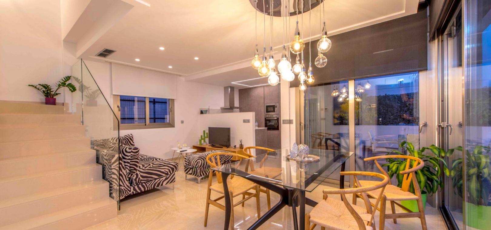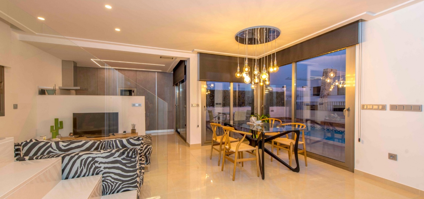 Vardagsrum/matsal, kök i öppen planlösning, 3 x dubbelrum, 2 x badrum, terrass, stor trädgård med privat pool, balkong på första våningen, uppfart för off-road parkering och mycket mer.