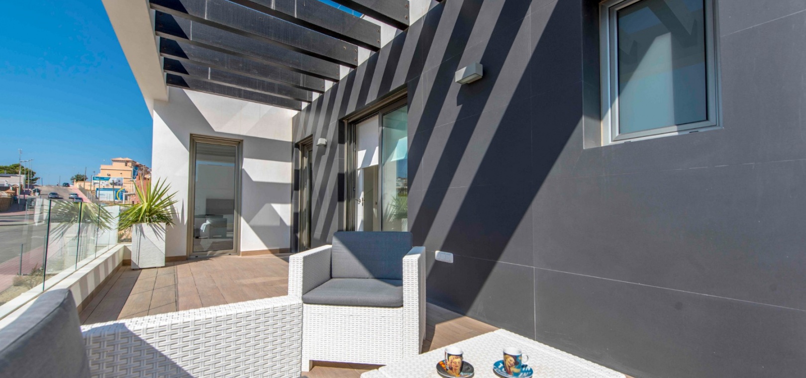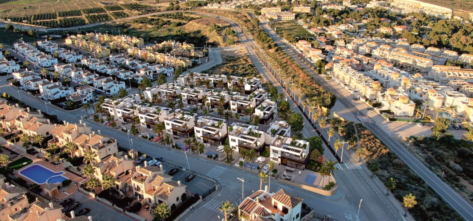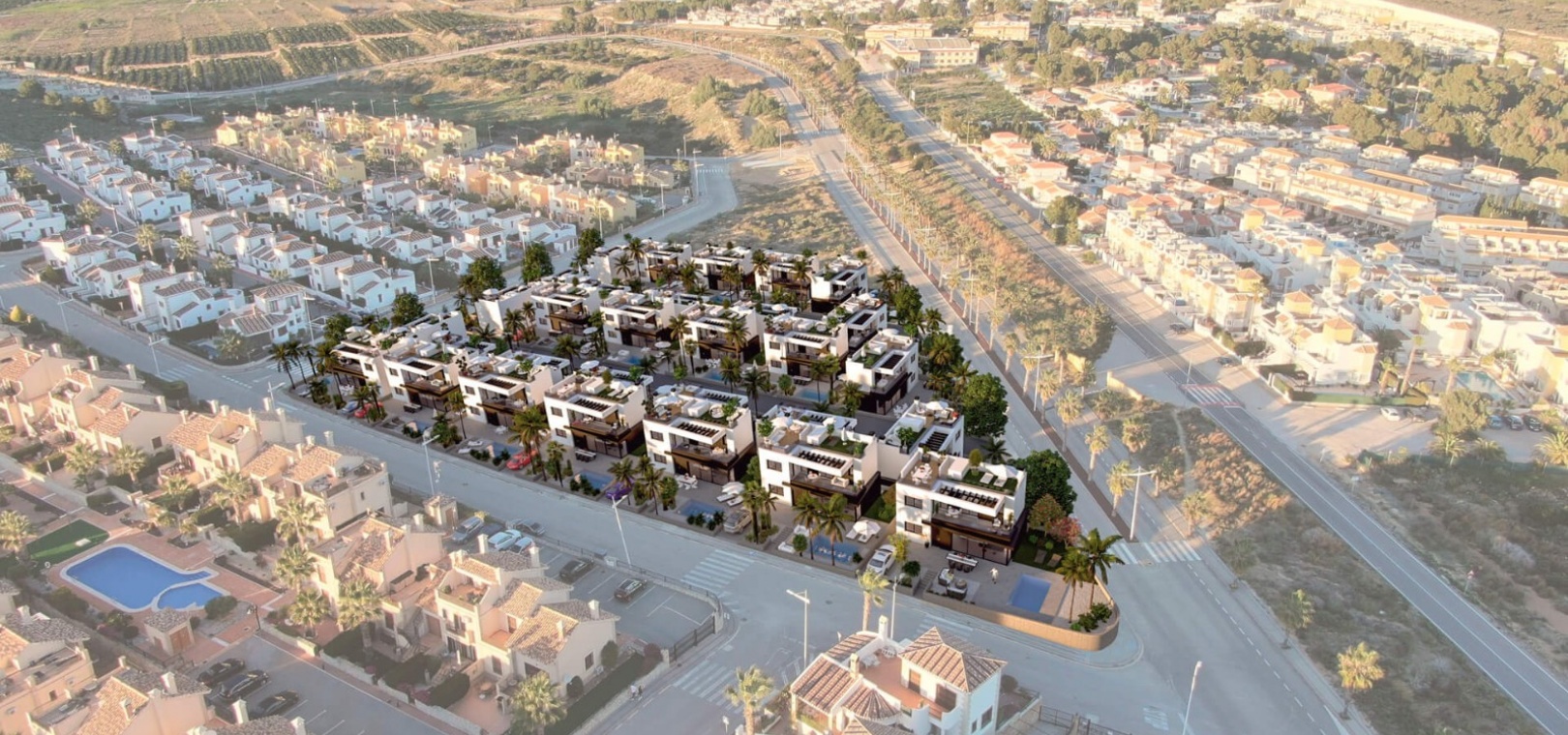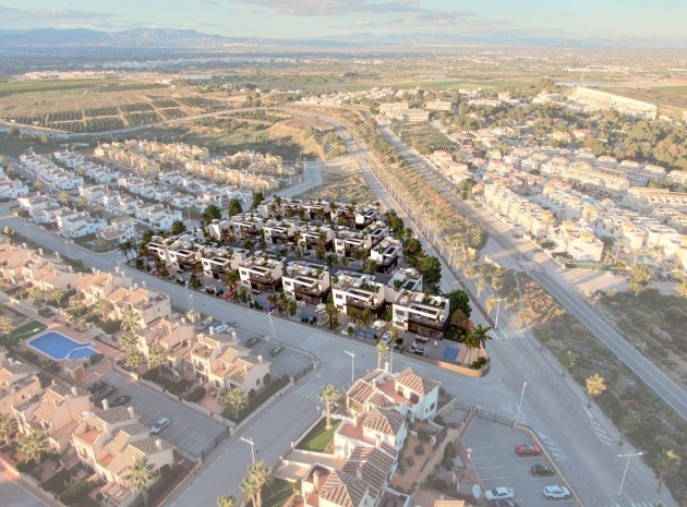 Dessa fastigheter ligger nära golfbanan och La Fincas kommersiella centrum där du hittar en stormarknad, bank, frisörer och flera barer och restauranger. Det finns också ett fantastiskt klubbhus och restaurang som inte är medlem och ett 5-stjärnigt spahotell. Byn Algorfa ligger några minuter med bil där du hittar alla bekvämligheter (banker, stormarknader, barer, restauranger, affärer, apotek, läkare, lokalbuss etc.). Det är bara 15 minuters bilresa till de vackra blåflaggade stränderna vid Guardamar Del Segura och cirka 35 minuters bilresa till Alicantes flygplats och Murcia Corvera flygplats ligger cirka 50 minuters bilresa bort.