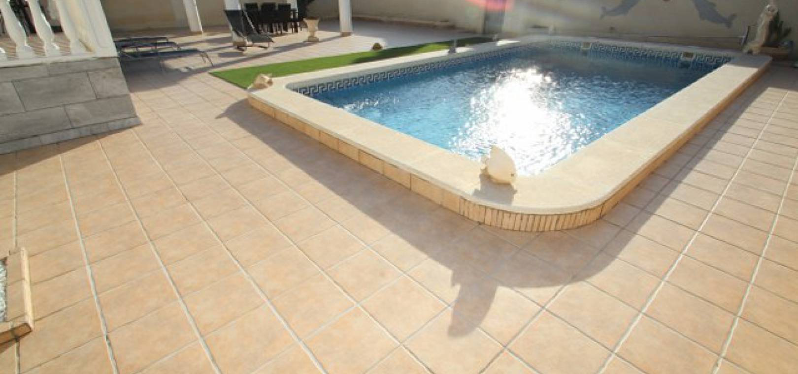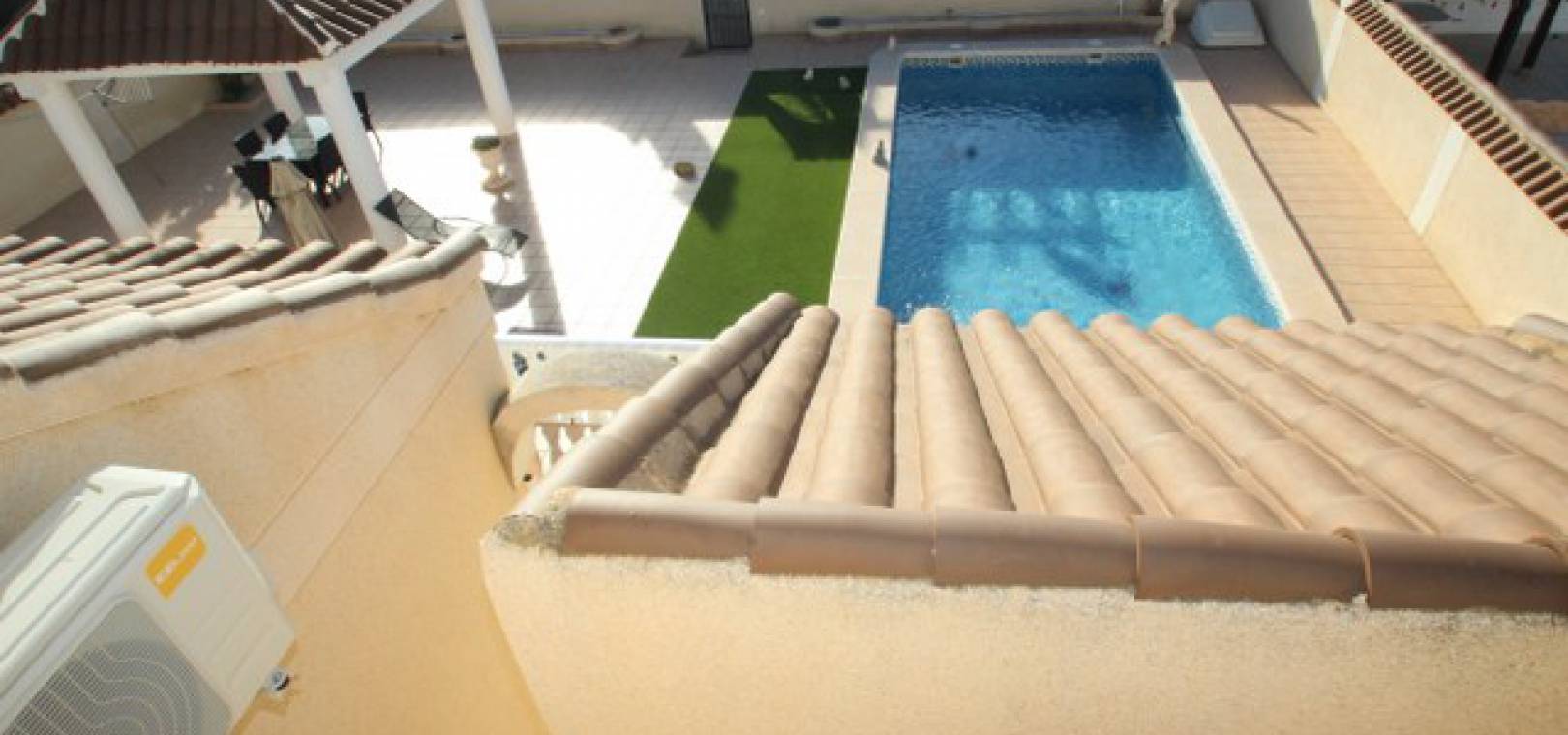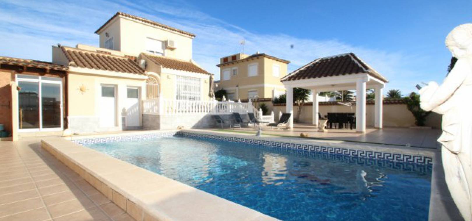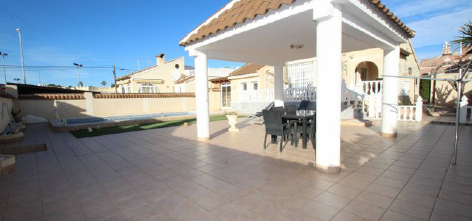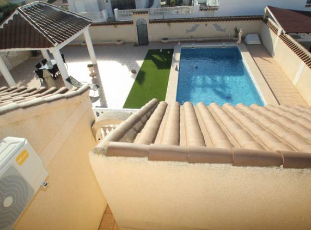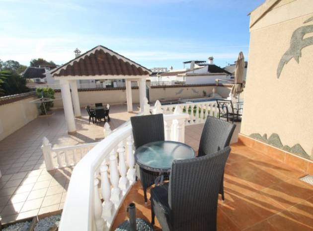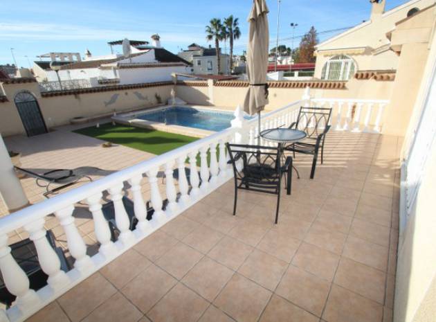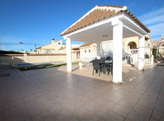 En villa med 3 sovrum och 3 badrum i spansk stil med en privat pool på en 800m2 tomt i Eagles Nest, Villamartin, Costa Blanca. Denna härliga fastighet säljs i gott skick och består mycket kort av följande:- Stort vardagsrum/matrum med varm och kall A/C, eldstad och takfläkt, öppet kök, 2 x dubbelrum båda med promenad -in garderober och badrum och ett stort renoverat familjebadrum. På solariet finns en liten fristående lägenhet med vardagsrum/sovrum, kök och badrum. Utanför finns en 800m tomt med privat pool, pergola, utekök och bar, W/CA och grovkök och mycket mer. Barer, butiker och restauranger ligger bara några minuters promenad bort. Den berömda Villamartin Plaza & golfbanan ligger mindre än 15 minuters promenad bort. Det är mindre än 10 minuters bilresa till de underbara Orihuela Costa Blue flag -stränderna (eller du kan använda lokalbuss) och det finns ytterligare 3 golfbanor inom 5 minuter kör. Alicante flygplats ligger 50 minuters bilresa bort.