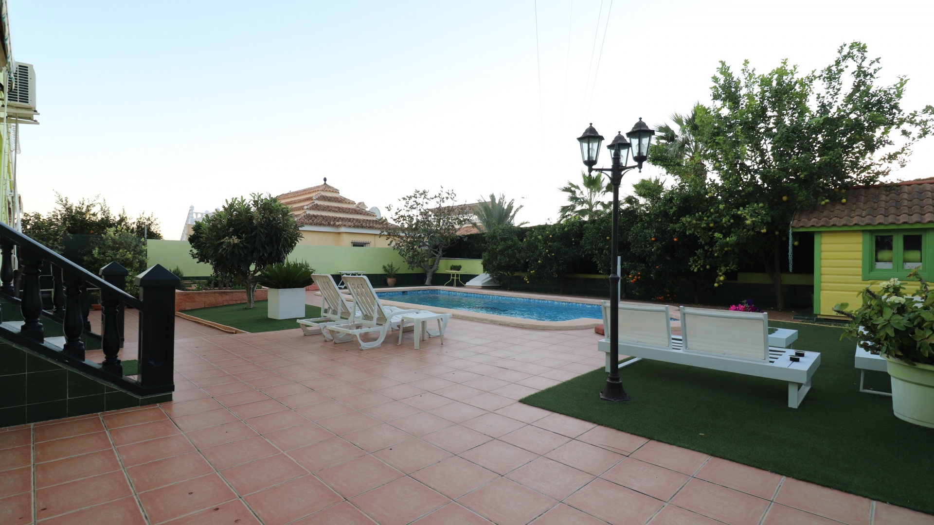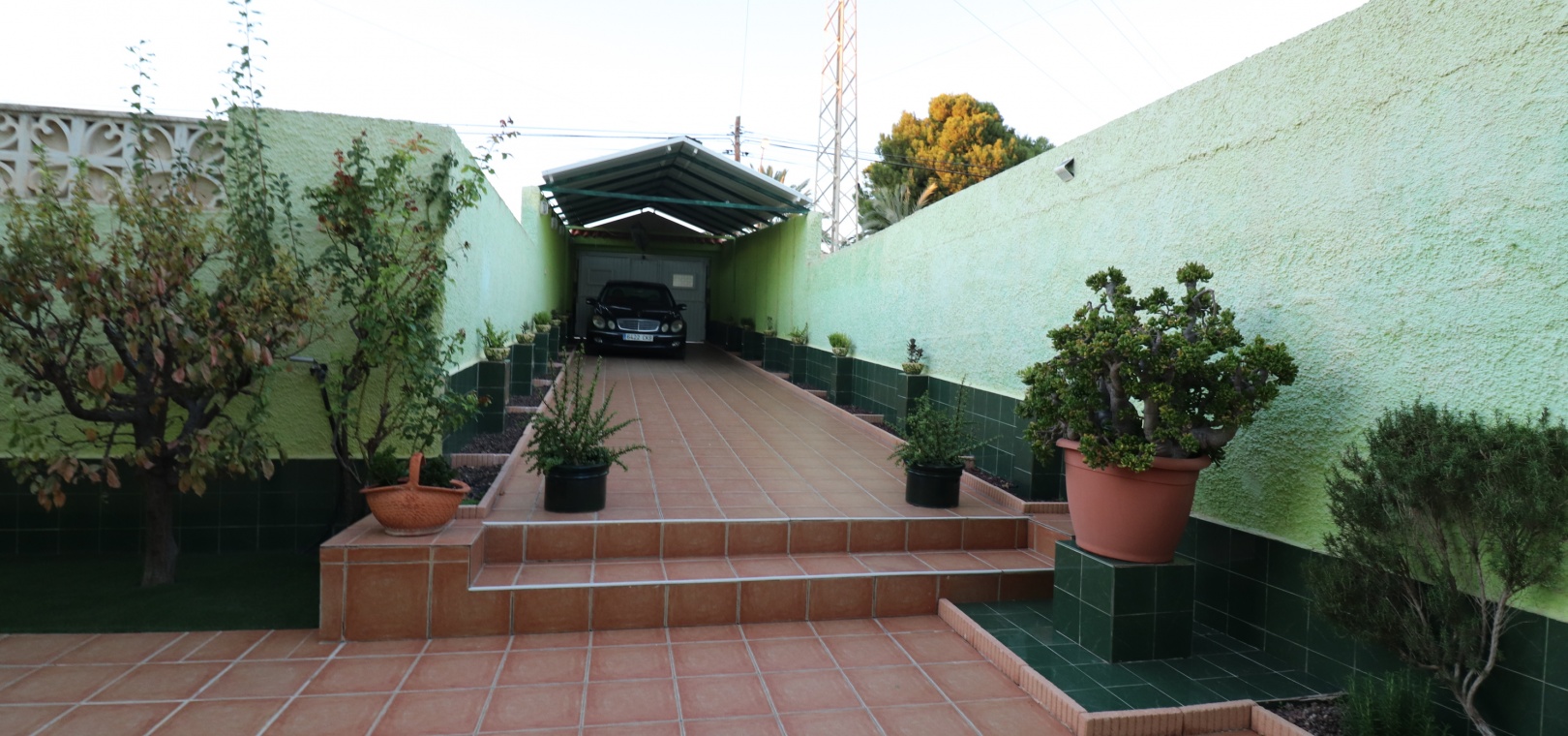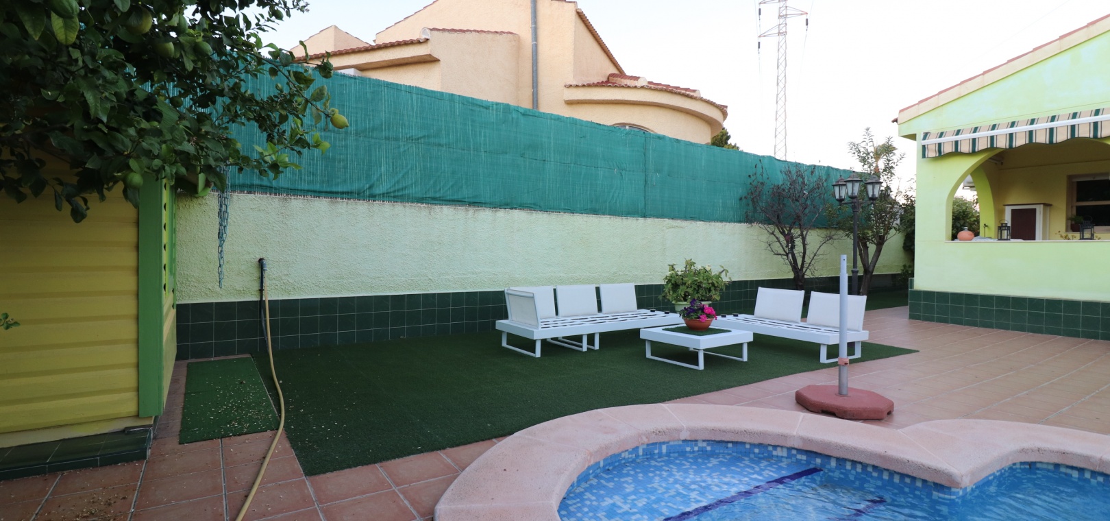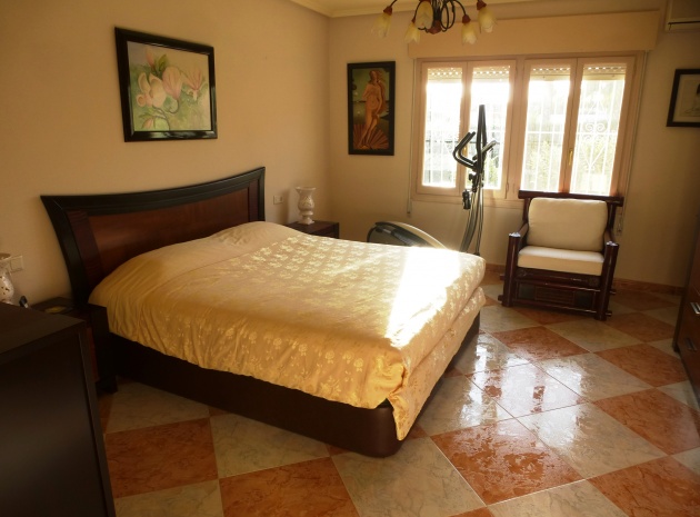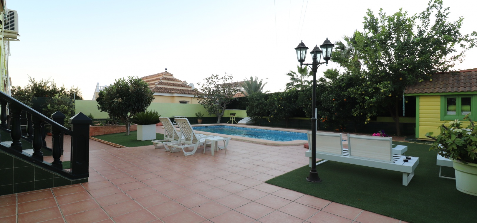 Denna personligt designade fristående villa med tre sovrum av hög kvalitet i Ciudad Quesada ligger centralt i denna livliga och mycket populära stad, inom 5 till 10 minuters promenad från ett brett utbud av barer och restauranger, butiker, stormarknader, tobaksaffär, apotek, banker, vårdcentral, optiker, resebyråer, gym, frisörer, bowling, minigolf och mer... De närmaste stränderna ligger vid Guardamar del Segura, bara 12 minuters bilresa bort. Denna vackra, välskötta fastighet består av en extremt rymlig bottenvåning med en vacker svängd entré; som öppnar upp mot det stora vardagsrummet med träbjälkar; ett öppet fullt utrustat kök med ett stort matbord och en dubbelsidig öppen spis som värmer upp hela vardagsrummet; en bred hall som för närvarande erbjuder ett skrivbord; med två mer än dubbelsidiga sovrum utanför; och ett familjebadrum. Från köket finns dubbeldörrar ut till den bakre täckta terrassen, perfekt för att äta utomhus med utsikt över den vackra trädgården och den privata poolen. Utvändiga trappor leder till den helt fristående första våningen; där det finns en separat lägenhet eller gästrum, bestående av ett öppet, fullt utrustat kök med matplats, soffa och utgång till den omgivande terrassen; en bred hall som för närvarande har våningssäng; som leder fram till det magnifika sovrummet med dubbelsäng, med klädkammare och dubbeldörrar ut till en privat terrass. Båda terrasserna på första våningen har panoramautsikt över området och saltsjöarna bortom. Utomhus finns ett kök, duschrum och toalett, gott om uteplatser för matplats och solbad, olika fruktträd, trädgårdsskjul och en lång uppfart, som är den enda anslutningen till vägen, vilket gör denna fastighet ganska privat! Extrafunktioner inkluderar luftkonditionering i vardagsrummet, köket och master bedroom, galler över hela bottenvåningen, vattenavhärdare och mer...